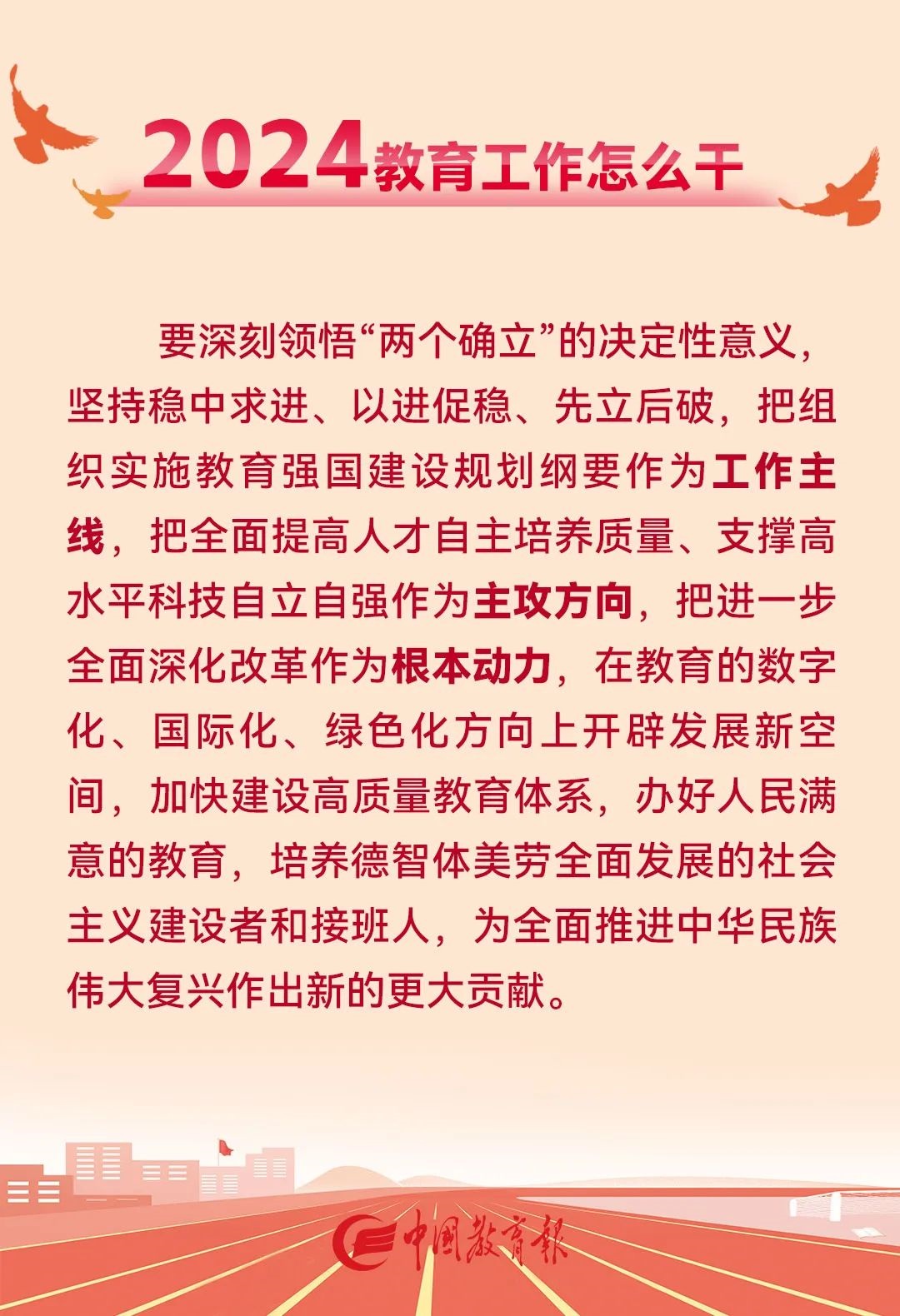 1月11日至12日,2024年全国教育工作会议在京召开。会议紧紧围绕深入学习贯彻党的二十大精神和习近平总书记在中央政治局第五次集体学习时的重要讲话精神,是建设教育强国、推进改革发展的部署会、交流会。一图看懂2024教育工作会议: