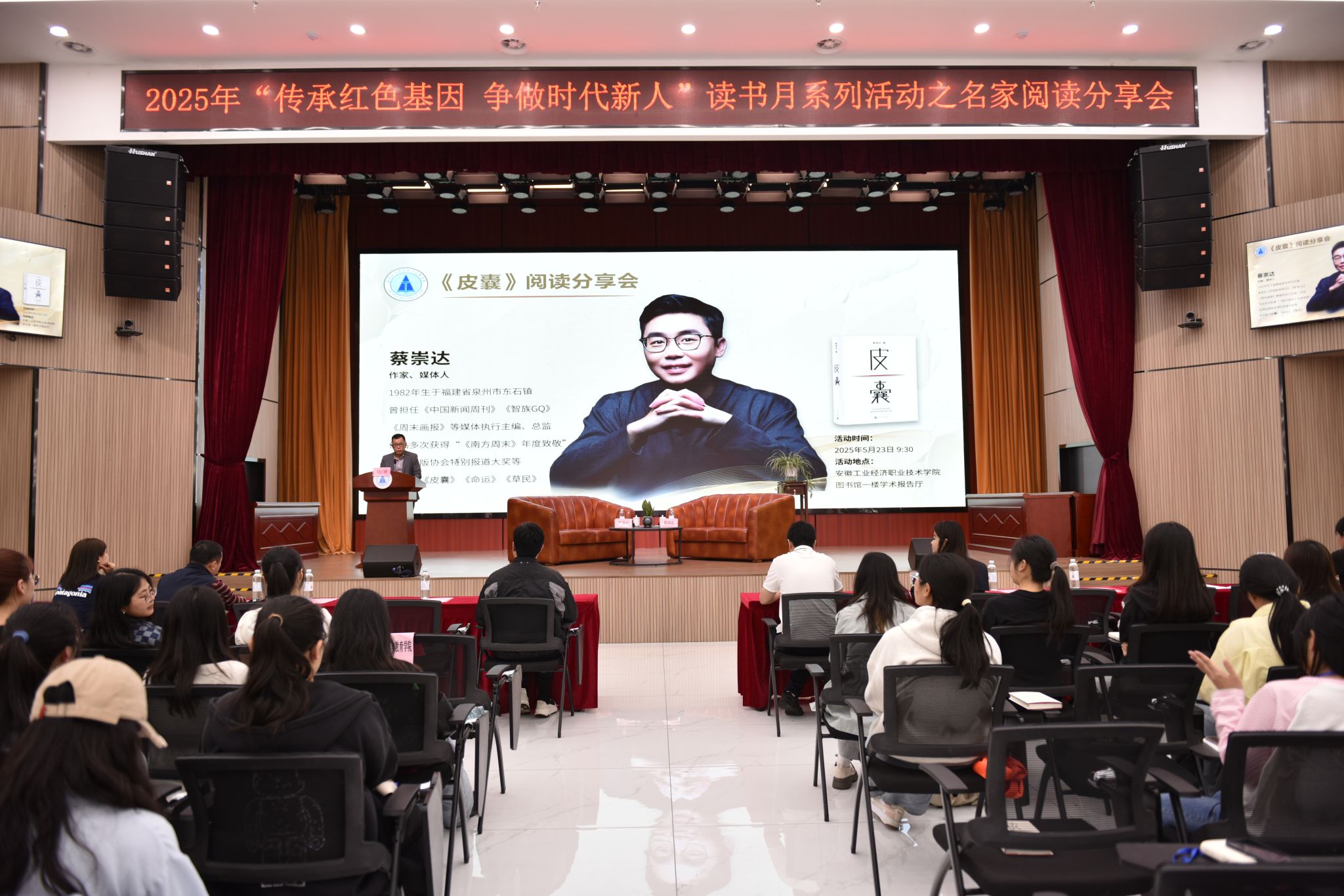 5月23日,在学院图书馆内,一场关于阅读、成长与人生的深度交流正在进行,知名作家蔡崇达携其经典散文集《皮囊》做客学院“树人讲堂”,与百名青年学子围坐畅谈,展开了一场穿透文字肌理的生命对话。这场由合肥新华书店有限公司、安徽新华传媒股份有限公司承办文学分享会,不仅是学院读书月系列活动的亮点,更展现了学院以“三业”精神(爱岗敬业、艰苦创业、建功立业)为内核的文化育人特色。