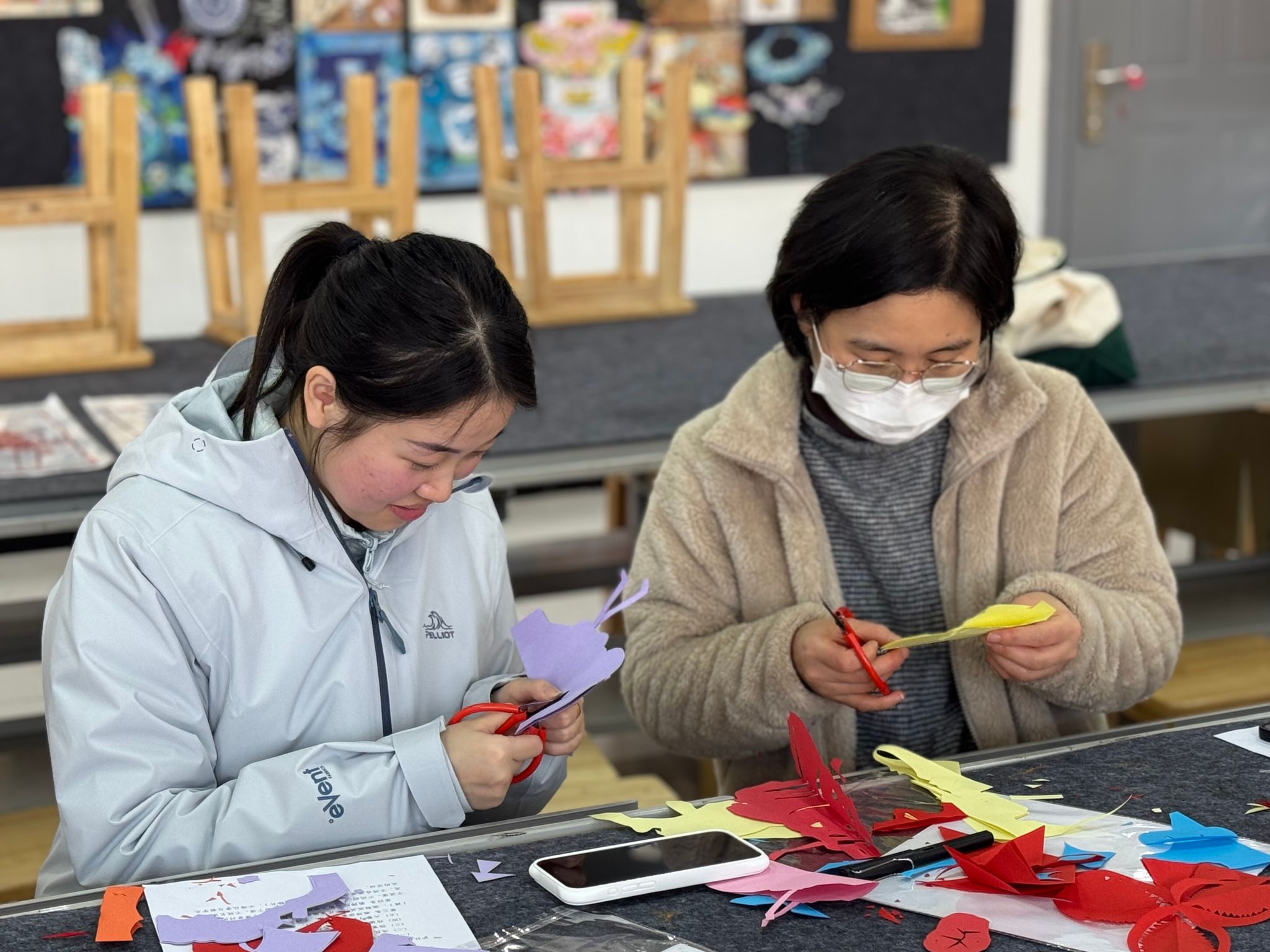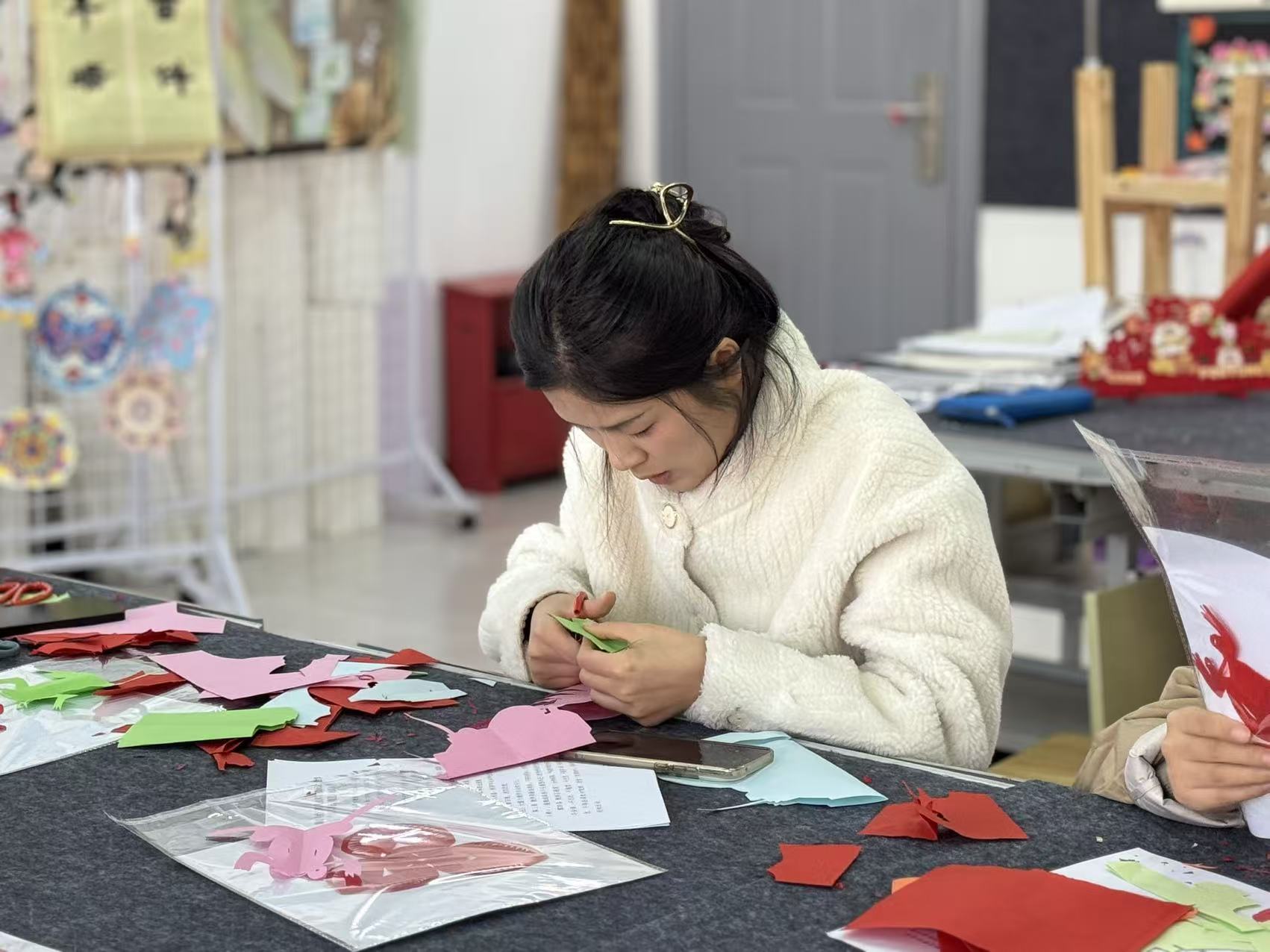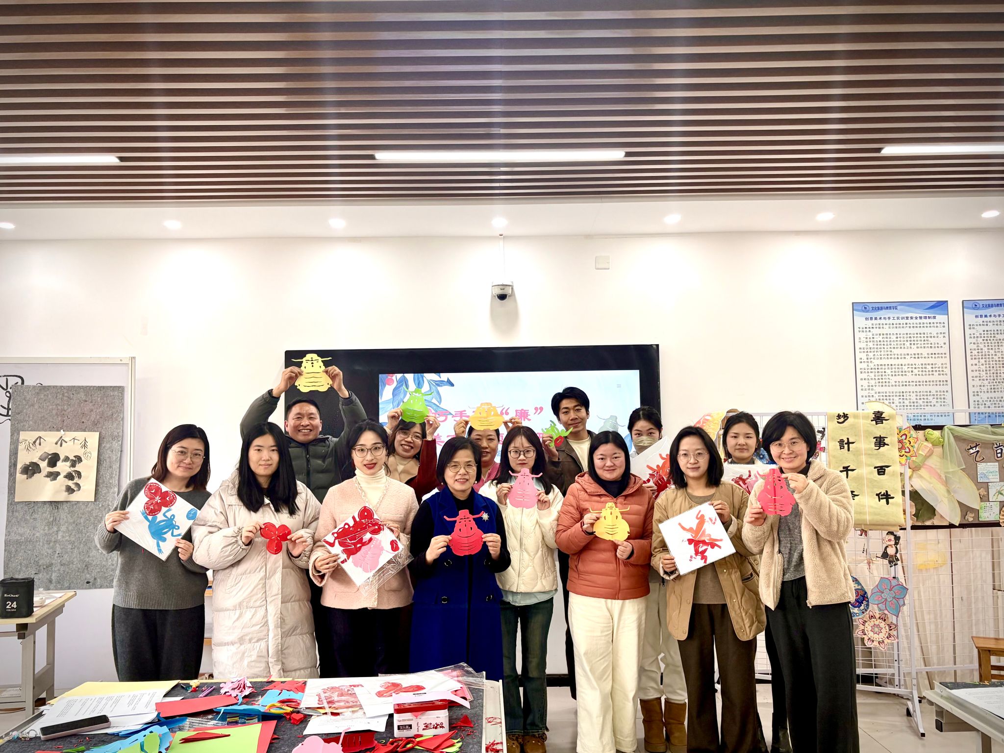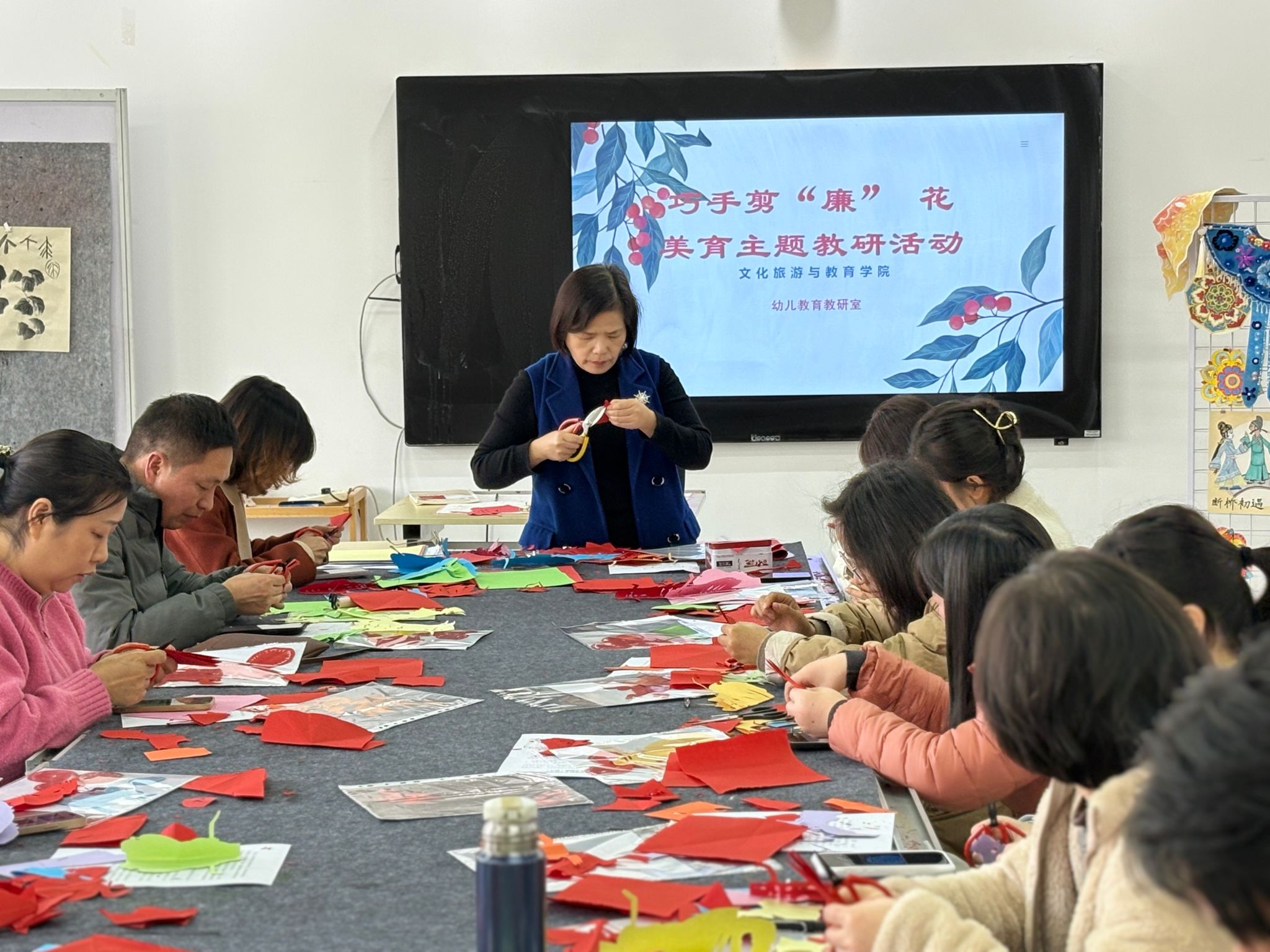 为深化专业教育教学改革,探索美育教学创新路径,12月3日下午,一场以非遗剪纸为载体的特色教研活动在文化旅游与教育学院创意美术与手工实训室成功举办。本次活动以“匠心剪廉韵,美育润初心”为主题,通过亲身实践和集体共创,探寻传统文化融入美育教学的有效方法。活动特邀合肥市“庐阳剪纸”市级非遗传承人俞自华老师现场授课,为老师们带来一场从指尖到心灵的美学体验。