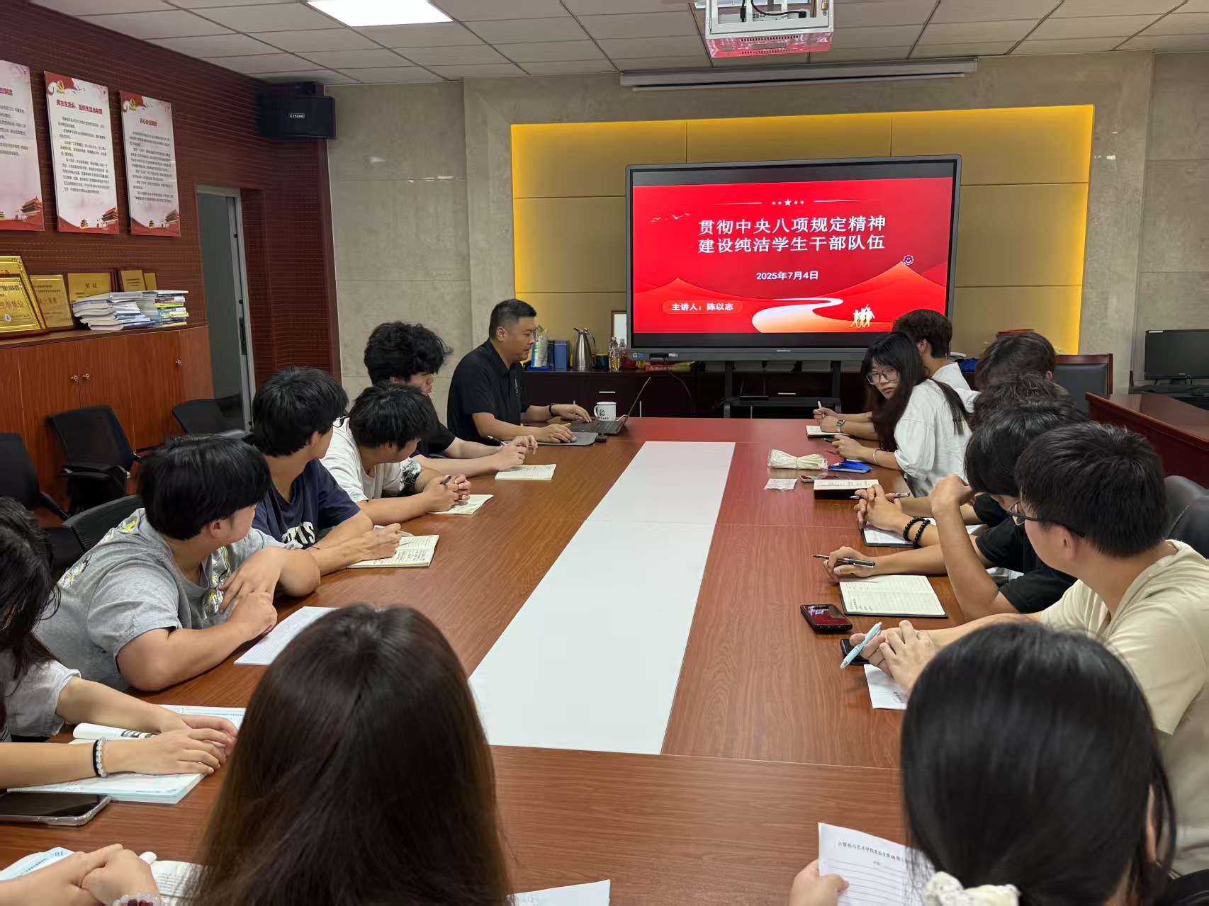(供稿:团总支 审核;陈以志 王厚红)为深入贯彻中央八项规定精神,强化学生干部队伍作风建设,营造风清气正的校园政治生态,学生党支部于7月4日举办“清风讲堂”专题教育活动。学生党支部书记陈以志、第十届团总支学生会成员和部分入党积极分子代表共计30余名学生干部参加活动。活动以“贯彻中央八项规定精神,建设纯洁学生干部队伍”为主题,通过专题宣讲、案例分析、互动研讨等形式,为学生干部上了一堂深刻的廉洁教育课。