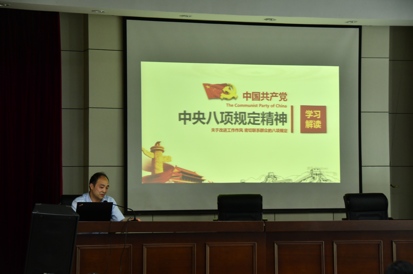 (供稿:斯炎 审稿:孙继胜)为进一步加强作风建设,维护党的先进性和纯洁性,推动全面从严治党向纵深发展,根据《关于在全院开展深入贯彻中央八项规定精神学习教育的实施方案》部署要求,4月28日下午,党委委员、副院长黄雪飞在行政楼一楼报告厅开展了以“学习解读中央八项规定精神”为主题的党课宣讲活动。机械与汽车工程学院党总支,学院团委、学生处、招生就业处、安保处、基建处党支部在职党员、预备党员和积极分子共同学习领悟中央八项规定精神的深刻内涵。
