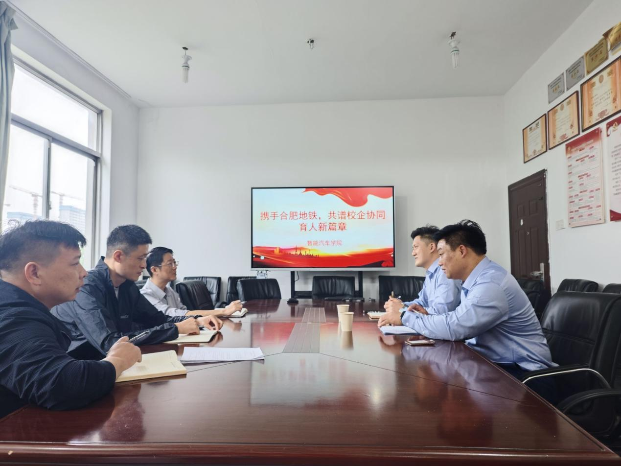 为进一步推进产教融合、校企合作,精准对接轨道交通行业人才需求,10月12日,合肥地铁尧渡河区域站黄迎涛主任、工经学院站站长王猛一行莅临智能汽车学院,围绕校企合作协议具体条款及未来合作方向展开深度洽谈,智能汽车学院副院长史召峰、党总支副书记郭强及轨道教研室主任朱荣军参加洽谈会。