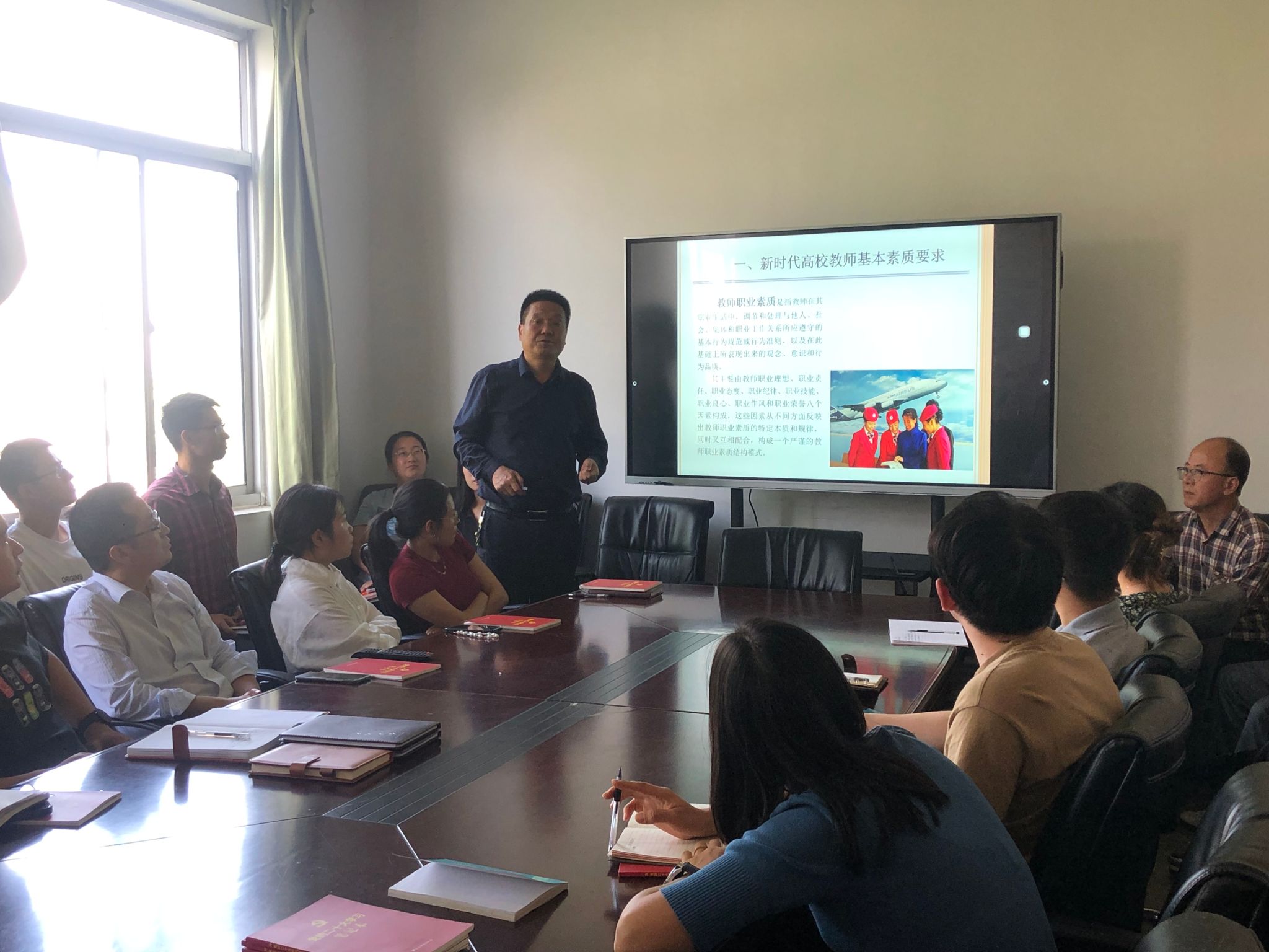 孙继胜书记以“树师德 扬师风 促清廉”为主题,围绕新时代高校教师基本素质要求、职业道德、职责使命、行为规范四个方面开展宣讲。会上详细解读了新时代高校教师的行为规范,高校教师要自觉提升政治高度,充分发挥引领作用,热爱教育事业、热爱教师岗位、热爱每一个学生;要保持对学术的敬畏之心、对学生的挚爱之心、对社会的感恩之心、对民族文化的传承之心以及对教育工作的创新之心,知敬畏、存戒惧、守规矩,不越红线,不踩底线,不碰高压线。