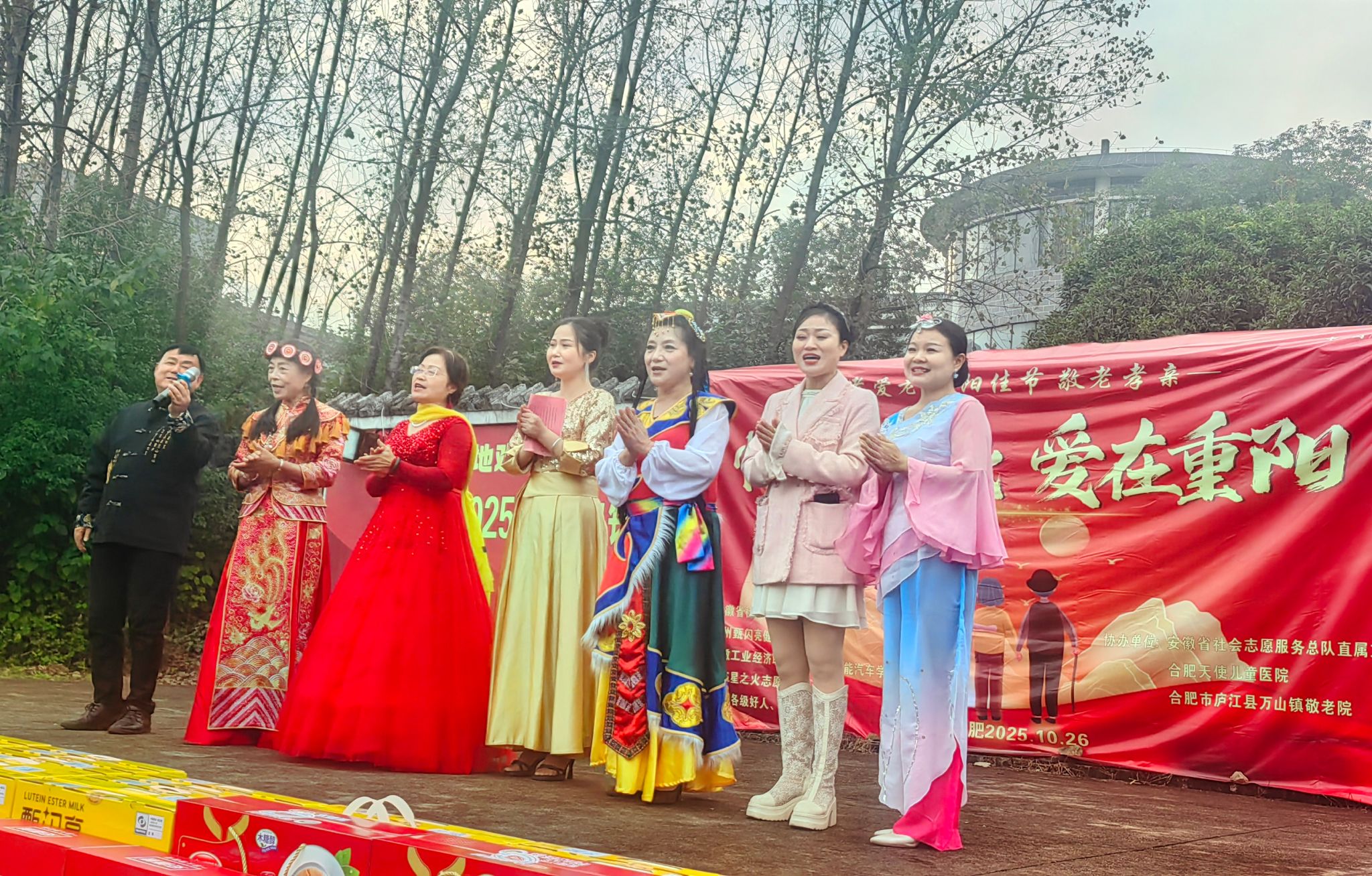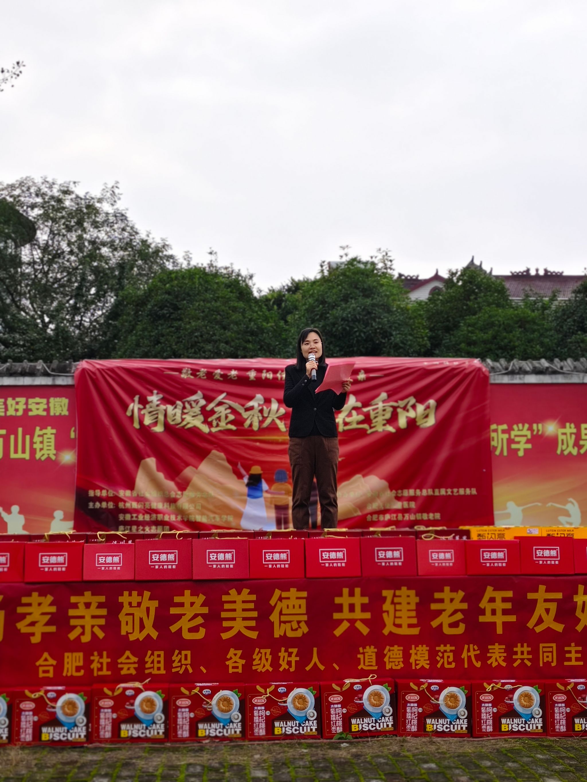 活动现场暖意融融,慰问环节在为老人系上象征吉祥的大红围巾中拉开序幕。庐江县万山镇党委委员沈怡首先致欢迎辞,向到场老人致以节日问候;中国好人单务民老师则为老人们送上饱含深情的重阳祝福,话语间满是对老年群体的关爱。
