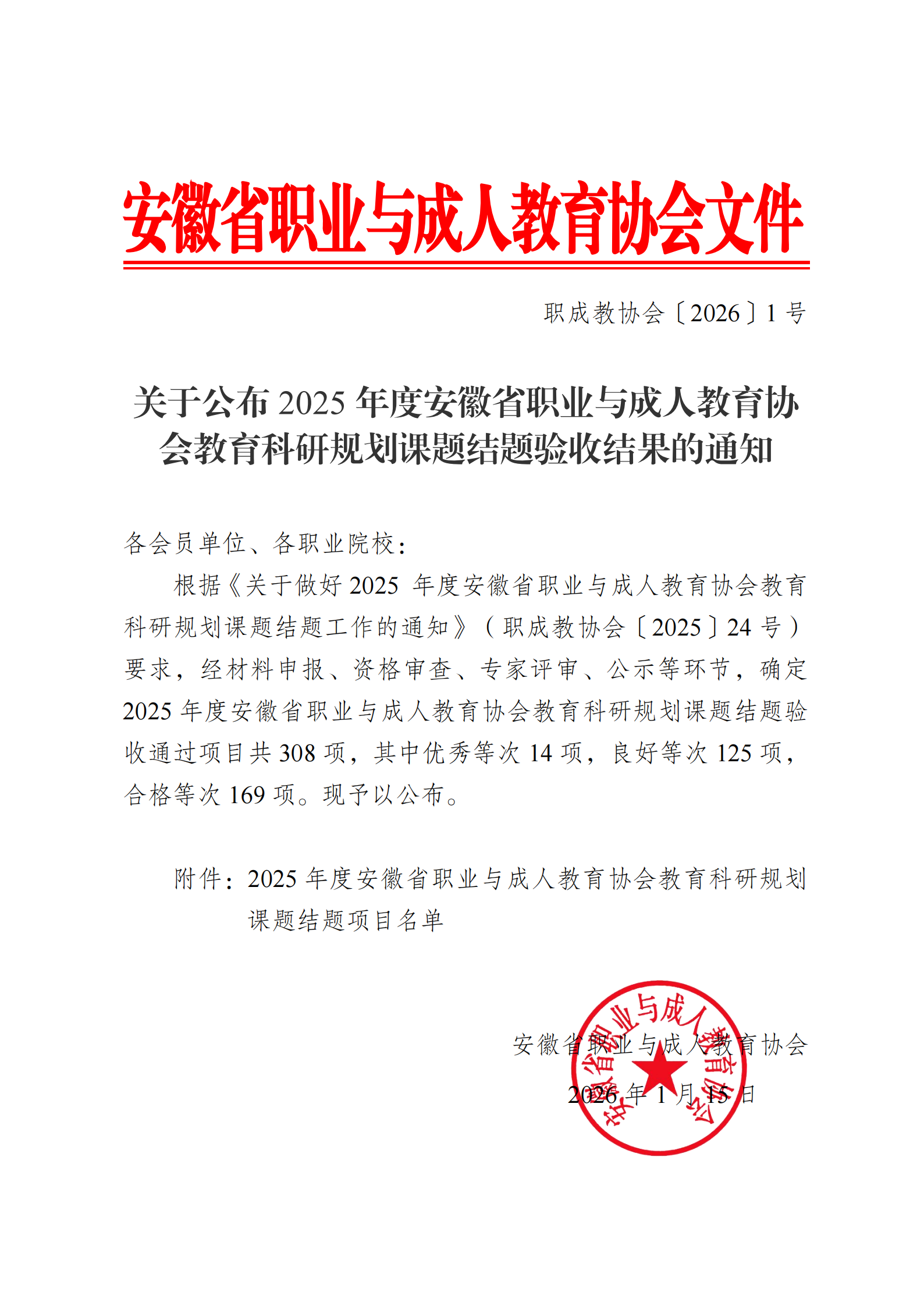 转发《关于公布2025年度安徽省职业与成人教育协会教育科研规划课题结题验收结果的通知》