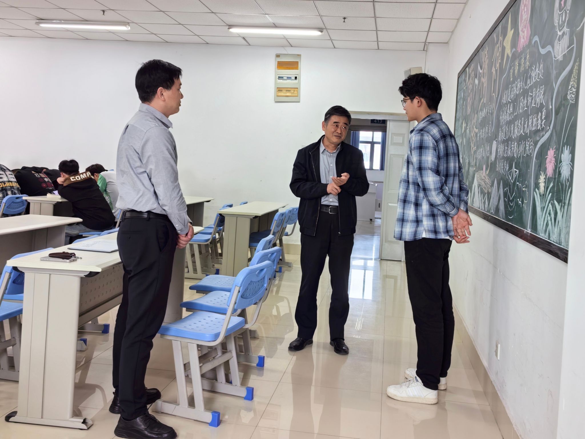 本网讯(马克思主义学院:沈成成 审核:葛军 佘东)为深入贯彻落实习近平总书记关于学校思政课建设的重要指示精神,推进思政课课堂教学提升行动和院领导联系思政课教师制度实施,4月8日下午,党委书记许卫深入教学一线听取马克思主义学院徐强老师主讲的“中共党史”课程。马克思主义学院院长刘仁三陪同听课。