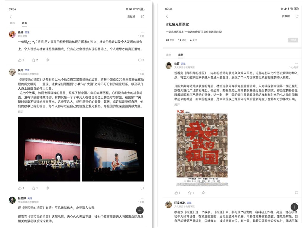 ”个人理想与社会理想相辅相成,只有在社会理想实现的基础上,个人理想才能真正落地。”看完电影后,来自财经学院的魏璇同学感慨满怀,她打开手机,登陆院团委设置的“一句话的感悟”线上分享版块,留下了自己的感言。“影片让我深刻感受到,个人命运与祖国发展紧密相连。无数普通人在各自岗位上发光发热,共同铸就祖国的辉煌。这不仅是对历史的致敬,更是对爱国精神的传承,它会激励着我们在新时代为祖国的繁荣继续拼搏。”文化旅游与教育学院的陈智同学也写下了自己内心满满的感动。观影同学围绕思政导师“微导学”的内容,通过“一站式学生社区”线上平台热烈表达自己内心的感受,激发出更多的思考和感悟。教师团队也可以适时参与引导,形成“观影有感、发言有思、讨论有获”的良性循环。