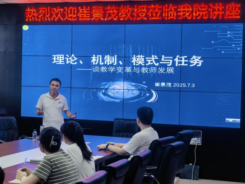(供稿:张丽丽  审核:宋庆福 潘文明)为深入贯彻职业教育高质量发展要求,推动课堂教学改革与教师专业成长,7月3日下午,商贸学院在主教楼810会议室举办专题讲座,邀请崔景茂教授作题为《理论、机制、模式与任务——谈教学变革与教师发展》的专题报告。商贸学院全体教师参加此次讲座。