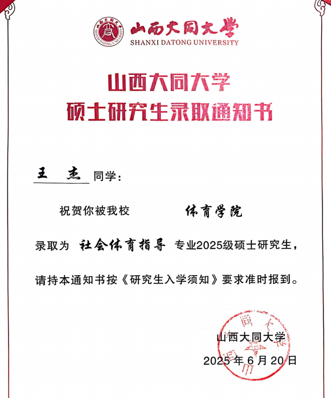 (供稿:张丽丽 黄莹 审核:宋庆福 潘文明)在2025年研究生考试中,我院市场营销专业王杰同学成功考取山西大同大学社会体育指导专业硕士研究生。他用一句话总结自己的备考心路:“我要做那个既能热闹也能平淡,既能风光也能独自走过低潮的人。”在平凡中默默积蓄力量,最终完成人生一次重要的跃迁。