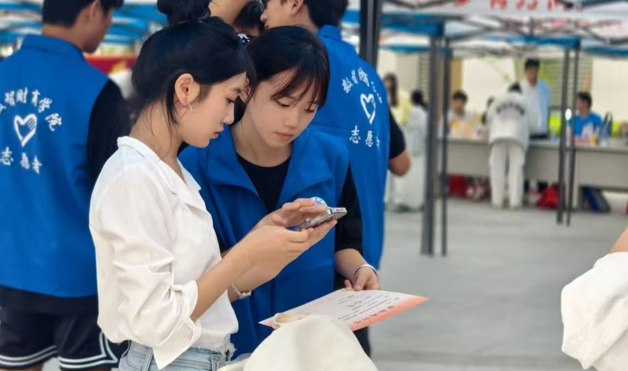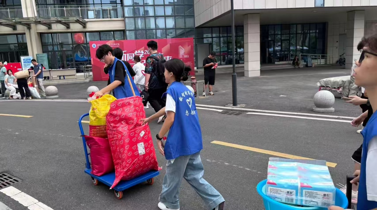 在迎新现场,一群身着蓝色志愿马甲的同学们格外引人注目。他们就像一群灵动的小天使,穿梭于校门、报到点、宿舍、路口等校园的各个角落,用自己无私的奉献和热情的服务,为新生和家长们排忧解难。从新生踏入校门的那一刻起,志愿者们就主动迎上前去,热情地为他们指引报到路线,帮助他们搬运行李。无论是沉重的行李箱,还是繁琐的报到手续,志愿者们都能耐心细致地处理,让新生和家长们感受到了无微不至的关怀。“同学,报到点在这边,我带你去。”“家长,您先休息一下,行李我来帮您搬。”一句句温暖的话语,一个个贴心的举动,让初到校园的新生和家长们倍感安心。