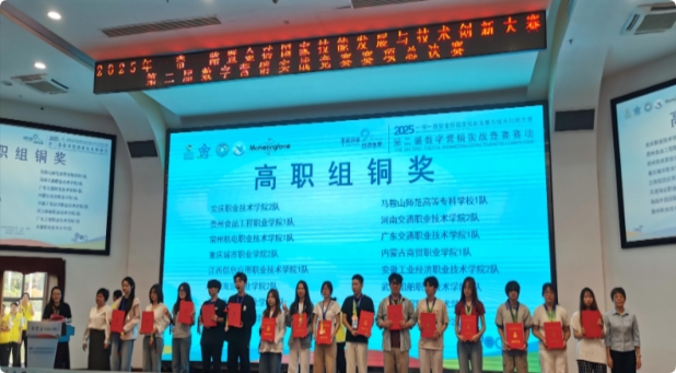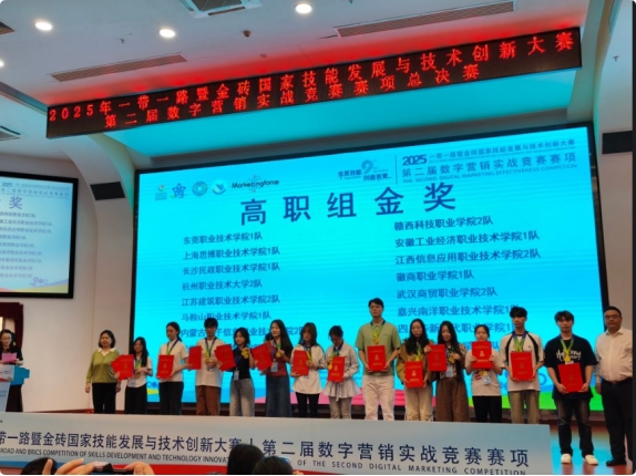 11月7日至9日,2025“一带一路”暨金砖国家技能发展与技术创新大赛第二届数字营销实战竞赛全国总决赛在东莞职业技术学院举行,我院谢斐、龚丽兰老师指导的李振华、朱传旗同学获得高职组国赛金奖,鲍玮、储娜老师指导的罗尚宇、张爱娟同学获高职组国赛铜奖,充分展现了我院学子卓越的专业技能与竞技风采。