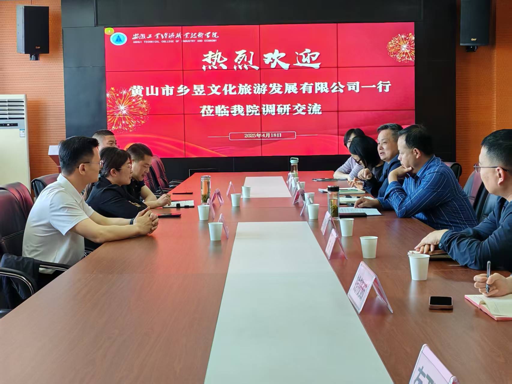 (供稿:左丁丁 审核:宋庆福 潘文明)2025年4月22日,黄山市乡昱文化旅游发展有限公司董事长吴俊一行四人到我院调研交流,共同探讨电商人才培养与文化旅游融合发展。商贸学院院长潘文明、文化旅游与教育学院院长谌莲莲、信息发展处处长赵晶丽、商贸学院党总支副书记宋庆福、办公室主任张丽丽以及电子商务教研室主任朱颖、旅游管理教研室主任韩珊珊和部分专业骨干教师代表参加了此次交流。