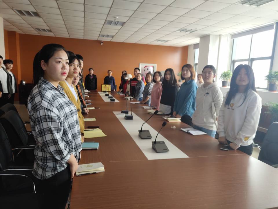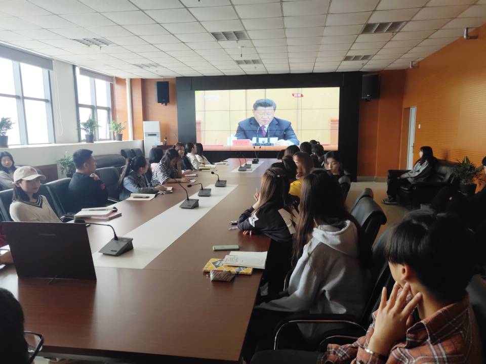 4月30日商贸学院领导和学生代表在主教810观看纪念五四运动100周年大会直播。党总支副书记张善智、学管许雷川以及学生代表参加。
