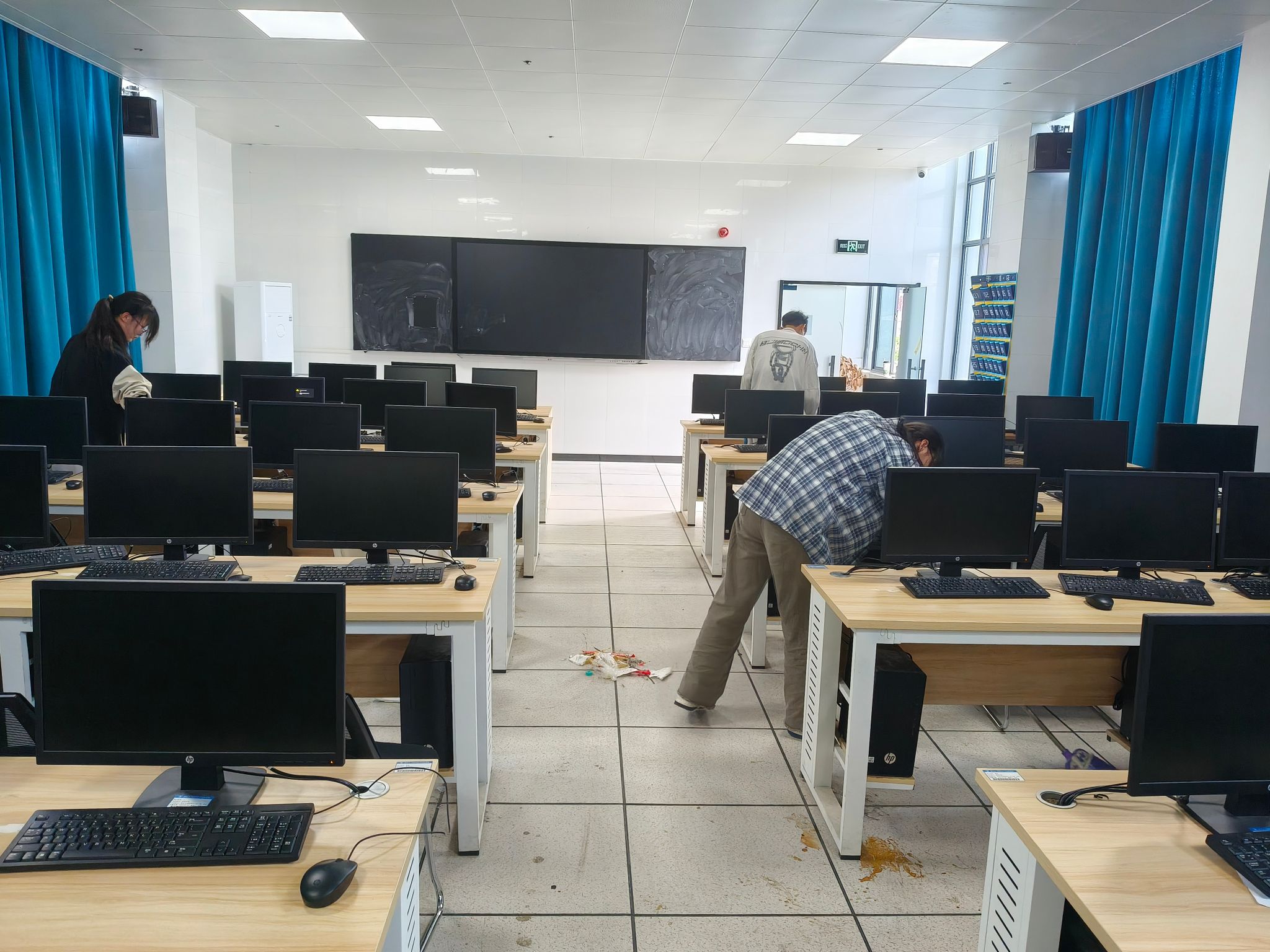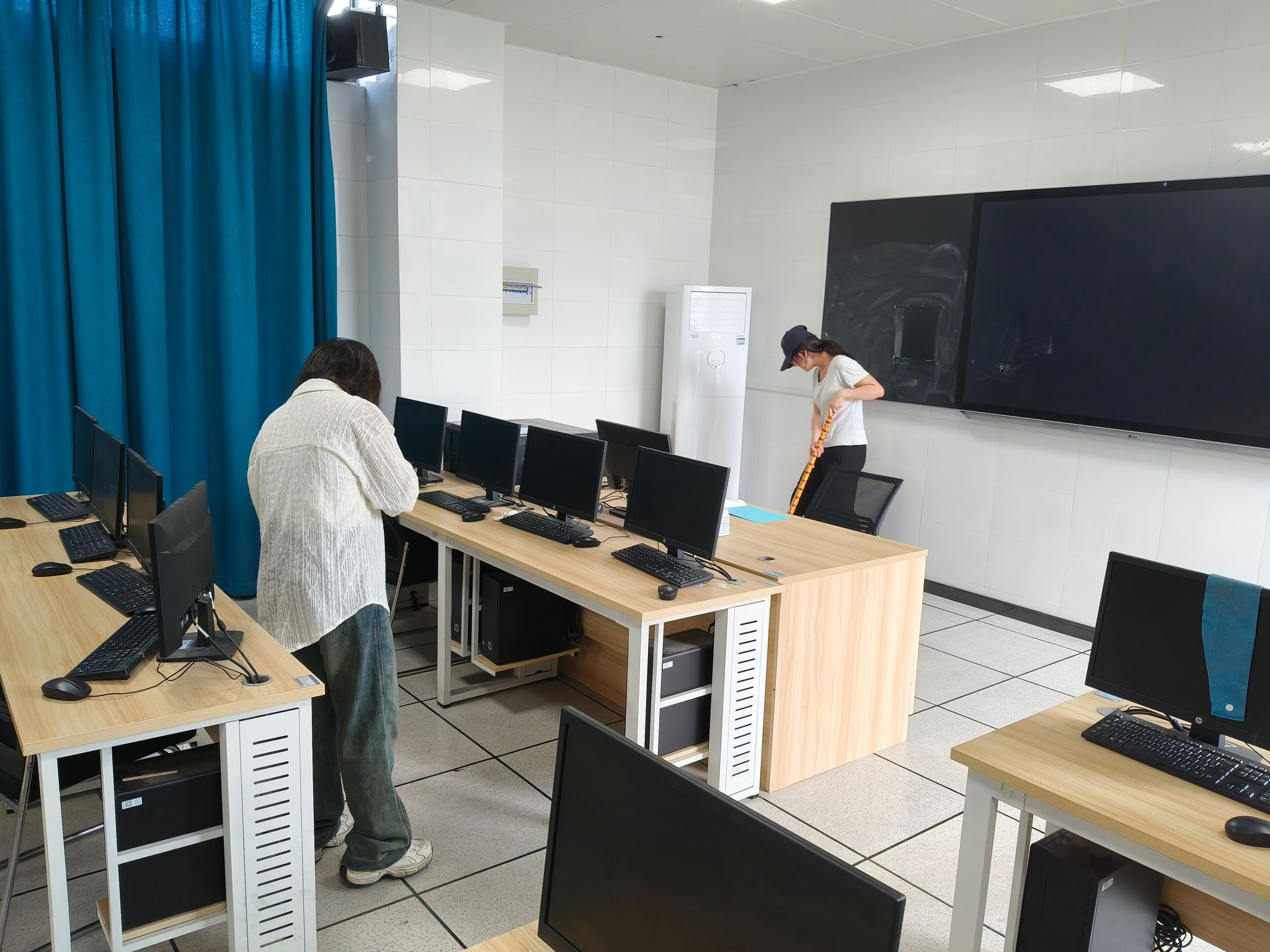 活动当天,学院组织电子商务、市场营销、商务英语、国际经济与贸易等专业学生分组对各类实训室进行全面打扫。学生们分工明确,配合默契,擦拭桌面、清理设备、整理线缆,不放过任何一个细节。整个过程井然有序,充分展现出新时代大学生良好的劳动素养与集体协作能力。