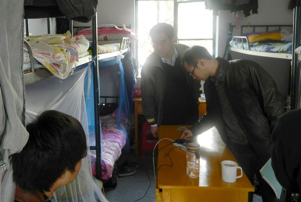 (系领导老师仔细检查学生宿舍用电情况)