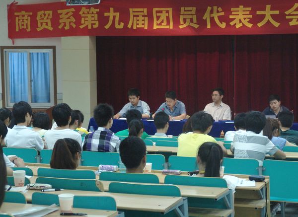 大会在慷慨激昂的中国共产主义青年团团歌中正式拉开帷幕。系党总支副书记张俊峰致开幕词。他指出,在建党九十周年来临之际,商贸系要继承传统,发挥优势,积极发展校园文化建设和主题教育活动建设。他对团学干部在提出四点希望,一是高举中国特色社会主义伟大旗帜,加强青年学生教育;二是彰显个性,促进学生全面发展;三是围绕中心,进行人才培养;四是强化特色,建设学习型团总支。同时他还对全系团学干部提出四点要求,即以德为先、善于学习、勤奋敬业和敢于负责。系主任姚明也在会上作了讲话,他要求学生会成员要积极配合加强学风建设,积极组织同学们参加活动,提高自身综合素质,从德智体美全面发展。随后,商贸系团代会暨学代会资格审查小组汪舒老师向大会报告了资格审查情况,系第八届学生会主席姚萌萌就过去一年的工作情况向与会代表做了报告,报告得到了与会代表的一致审查通过。王辉老师向与会的学生代表介绍了第九届团总支学生会选举办法,经过竞选演讲、现场投票、唱票、计票等相关程序,当场产生了许江、李炎等22名团总支学生会干部。