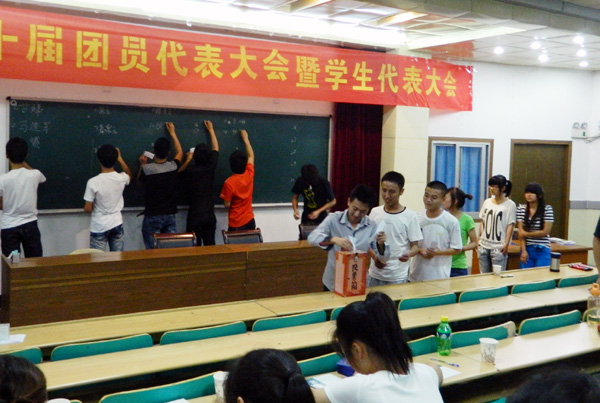 大会表决通过了团代会暨学代会代表资格审查。第九届商贸系学生会主席许江做工作报告总结。王辉老师宣读候选人和选举方法后,30名候选人轮流上台发表了激情澎湃的演讲,赢得了阵阵掌声。经过各代表的认真选举,大会现场唱票、记票,公布选票,当场产生了新一届21名团总支学生会干部。当选的21名学生会干部在王辉老师的带领下进行了就职宣誓。最后,系团总支副书记陈敏向2011级团总支学生干部和优秀学生干部颁发了聘书和荣誉证书。(商贸系行知报社: 方颖、章凤至)