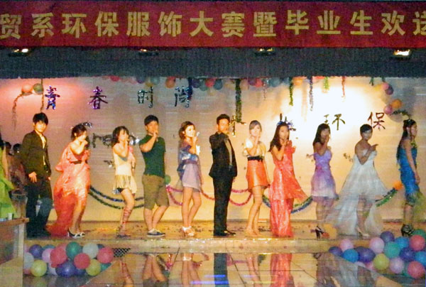 5月17日晚,商贸系第七届“青春时尚,个性环保”为主题的环保服饰大赛暨欢送2012届毕业生晚会在学院多功能厅隆重举行, 41021、41022班夺得环保服饰大赛桂冠。系党总支副书记张俊峰,团总支书记武迪以及戴学东、张威、赵磊、金平、朱颖、方栋栋、解路、王辉、王天意等老师出席了晚会,2010级和2011级12个班级代表队参加了晚会。