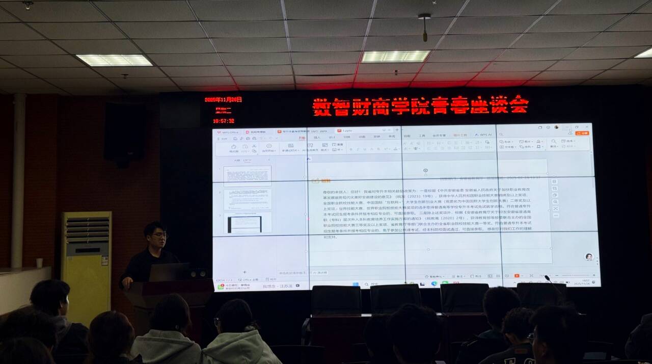 2025年11月28日,数智财商学院于主教810成功举办“青春引航,榜样面对面——大赛及专升本经验分享会”主题座谈会。本次活动聚焦立德树人根本任务,通过优秀学子的经验传承,为在校生在专业技能竞赛与学历提升方面提供精准指导,助力构建积极向上的校园学风生态。