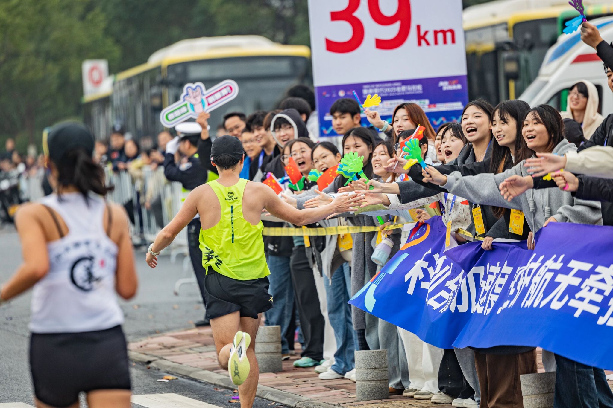 11月9日比赛当天,太阳升起,赛道沸腾,第二批志愿者准时上线,“战斗模式”全面开启。指引岗上,“呐喊担当”们即便嗓子喊哑,仍执着地为跑者鼓劲,一句句“加油!终点不远了”点燃了无数选手的斗志;沿途角落,“坚守担当”们顶着秋风站成标杆,用温暖的微笑回应每一次挥手与感谢。