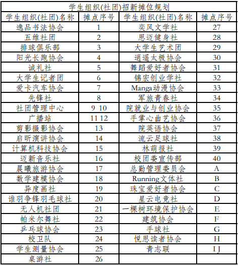 2、每个摊位的桌椅为学生社团管理中心统一安排,各学生组织在招新期间妥善保管桌椅,如有丢失负责找回或赔偿;