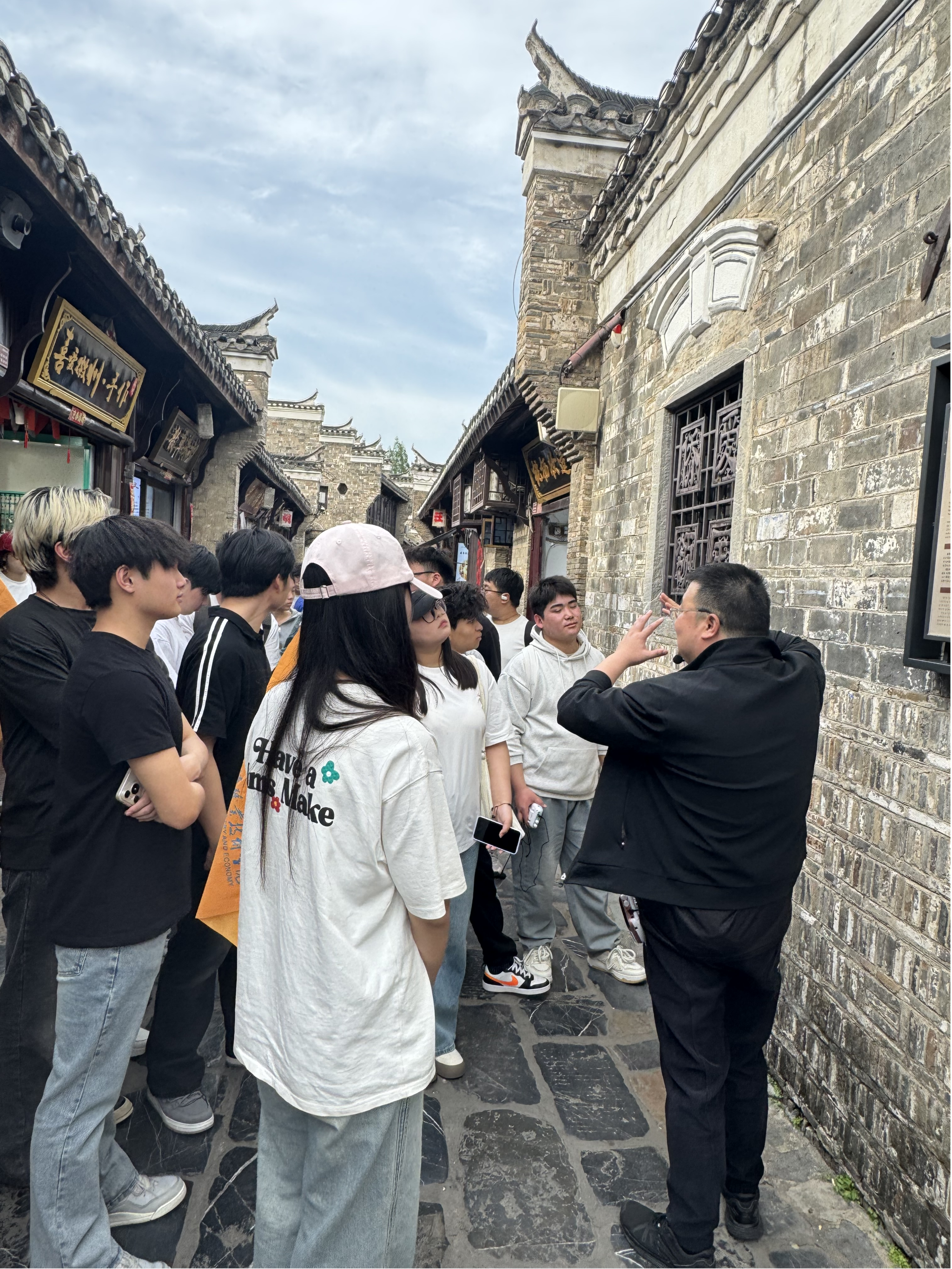 抵达古镇后,樊有成副会长结合杨振宁旧居、刘同兴隆庄等特色景点,现场示范“因人施讲”“情景代入”等导游技巧。他以丰富的行业经验,深入浅出地分享讲解要点,并引导同学们围绕红色文化传承、文旅融合创新等热点议题展开讨论。同学们积极提问、踊跃互动,在思想碰撞中对导游职业的时代使命有了更深刻的理解。