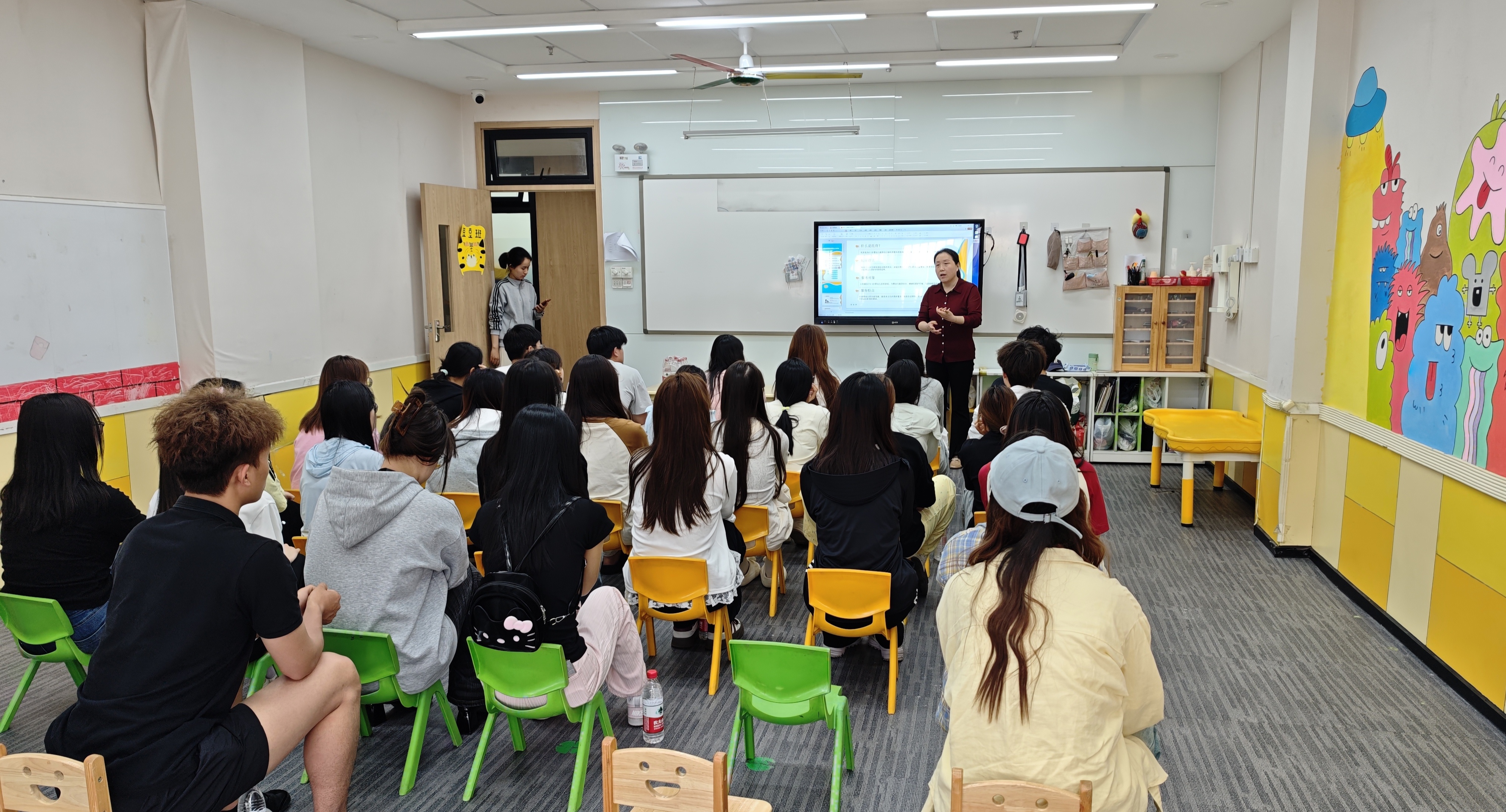 活动伊始,王园长对师生们的到来表示热烈的欢迎,并向师生们详细介绍了机构的发展历程、服务理念、课程体系以及运营管理模式。随后,她引领学生们深入各功能区,依次参观了托育教室、活动区域、餐饮室、休息区等功能场所,让学生们对托育机构的空间布局、设施配备、环境创设等有了直观认识,全面感受到该中心在幼儿成长环境打造上的精细与用心。