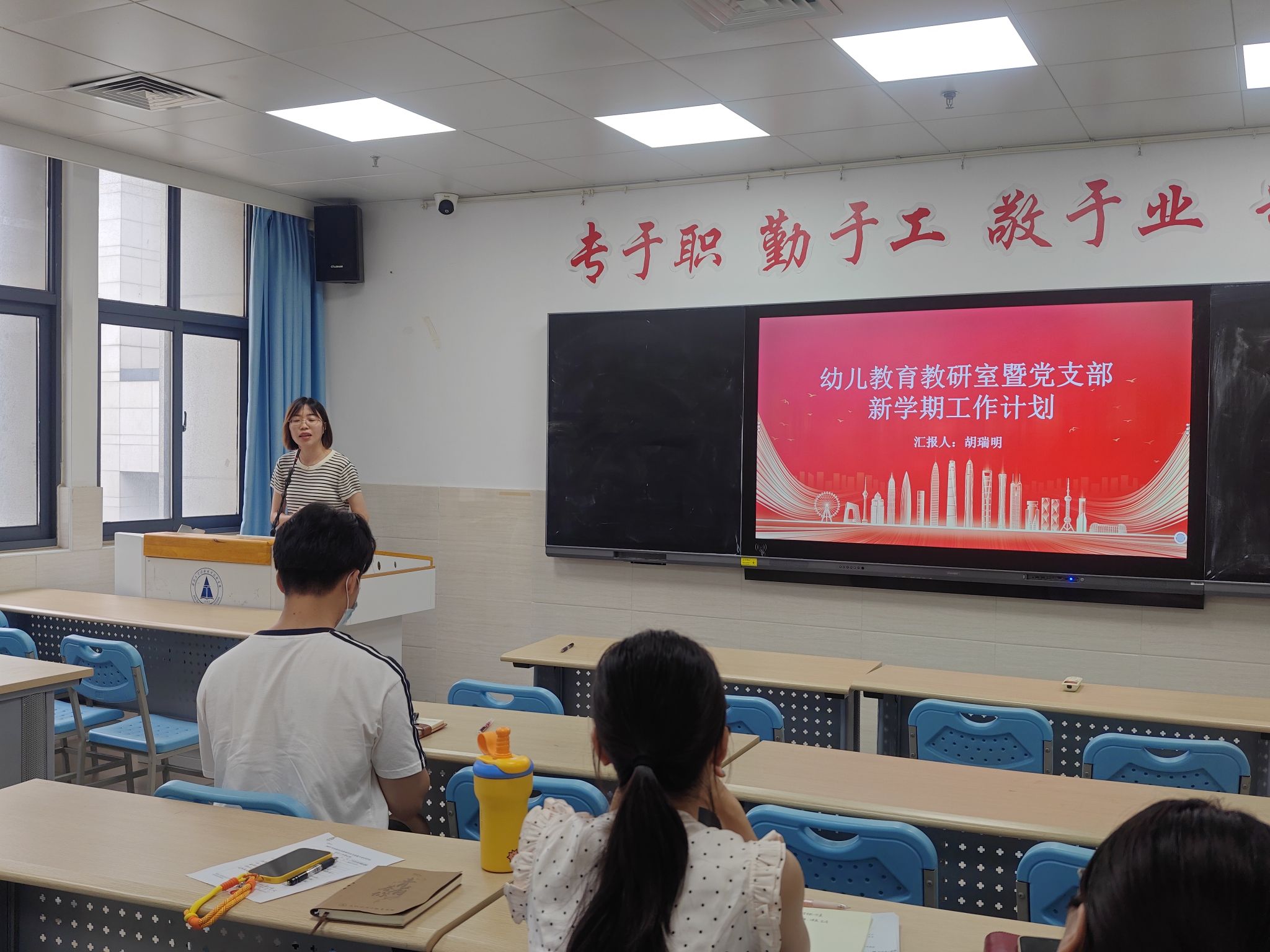 会议最后,胡瑞明老师作为幼儿教育教研室主任暨党支部书记汇报新学期工作计划,明确“党建引领、学习赋能、研究驱动、实践创新”四位一体发展愿景及1-3年中期目标,从团队建设、课程建设、科研工作、人才培养、社会服务五方面明确任务。她强调,新学期教研室需以“学习型组织”建设为基础、“创新型教师”培育为核心、“产教融合”为突破点,实现教师专业成长与人才培养质量提升的双重目标。