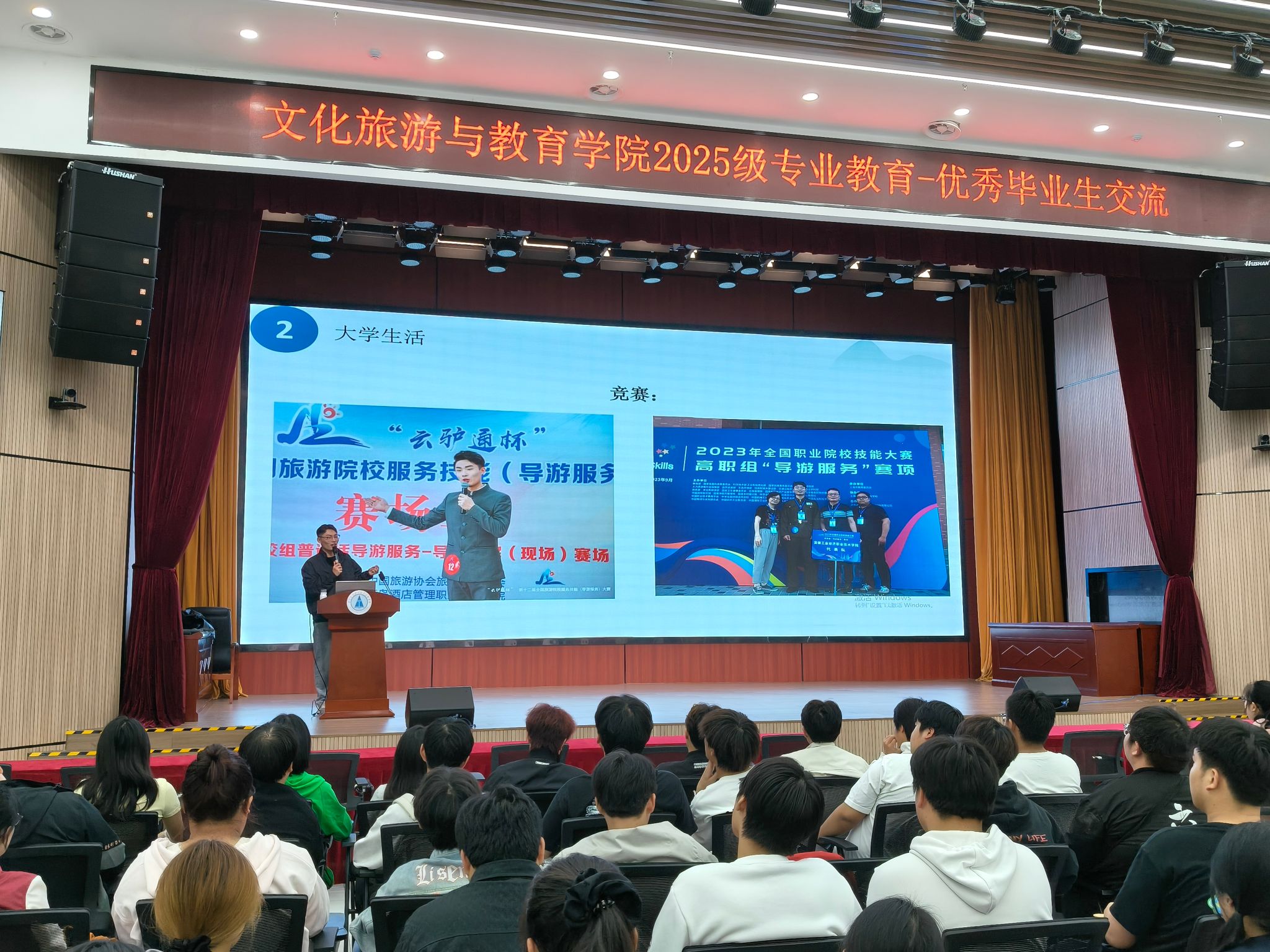为提升2025级旅游管理和酒店管理与数字化运营专业的新生对学院和专业的认同感、归属感与自豪感,10月15日,文化旅游与教育学院邀请了酒店管理专业优秀毕业生罗继宗和旅游管理专业优秀毕业生刘坤分别为酒店管理与数字化运营专业的98名新生和旅游管理专业的135名新生开展了气氛热烈的交流会,帮助新同学快速适应大学生活,明确专业学习目标和方向。