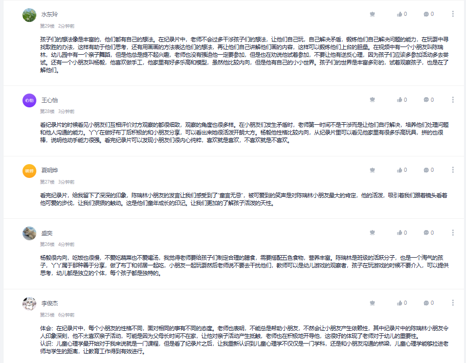 活动现场,新生们跟随纪录片镜头,走进孩子们的游戏世界——从沙池里的“城堡搭建”到角色扮演中的“小医院诊疗”,从自然探索中的“昆虫观察”到合作游戏里的“规则建立”,镜头下儿童的专注、创造与成长,让在场新生深刻意识到“游戏是儿童的基本活动”并非抽象理论,而是贯穿学前教育实践的核心准则。“原来一块普通的积木,能让孩子在动手中理解空间关系;一次简单的角色扮演,能帮助他们学会共情与沟通。”新生李同学在观影后分享道,纪录片让她真切感受到,学前教育不是“看管”,而是用专业陪伴孩子探索世界。