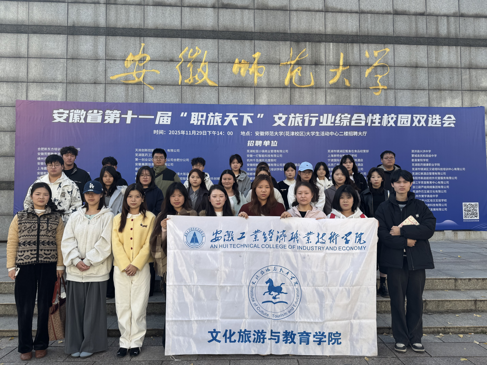 为拓宽文旅专业就业渠道、搭建校企对接平台,11月29日,文化旅游与教育学院组织学生赴安徽师范大学花津校区参加安徽省第十一届“职旅天下”文旅行业综合性校园双选会,实地对接文旅行业岗位资源。