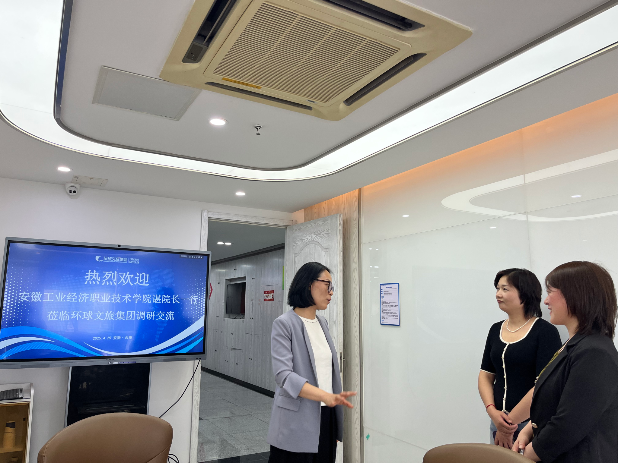 (作者:文化旅游与教育学院 韩珊珊 审核:谌莲莲 邱竹青)为进一步优化旅游类专业人才培养方案,增强学生实践能力与就业竞争力,同时为文旅行业输送更多高素质技术技能型人才,4月25日,文化旅游与教育学院院长谌莲莲、旅游管理教研室主任韩珊珊、研学课程团队教师张林和孔妮一行4人,前往安徽环球文旅集团开展专题调研。调研过程中,与企业领导、相关负责人深入交流,就文旅人才培育、专业课程建设及文旅产业新业态发展等核心议题展开商讨,为学院专业建设与人才培养注入新动能。