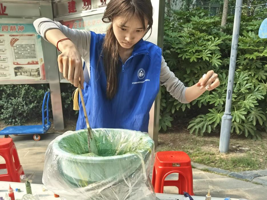 活动前,志愿者们提前抵达活动区域开展场地布置,有序搬运并安放水桶、颜料等物资,仔细擦拭被颜料沾染的瓶身,确保材料清洁到位。活动开始后,志愿者们全程专注配合老师们的漆扇制作,根据创作需求及时添加染料,待作品完成,小心收取漆扇并逐一悬挂至指定晾干区,调整扇面角度确保平整,避免扇面相互粘连。志愿者们以规范的操作和高度的责任感,高效且有力地保障了活动的顺利进行。活动结束后,志愿者们有序倾倒废弃染料水,清理桌面颜料残迹,归位整理水桶、桌椅等物资,快速完成收尾工作,确保活动场地恢复整洁。