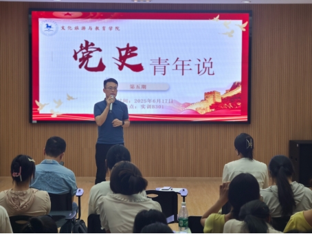 (作者:文化旅游与教育学院团总支 周怡雯 吕刚 审核:谌莲莲 邱竹青)6月17日,文化旅游与教育学院“党史青年说”第五期主题宣讲活动在学院智慧旅游实训室成功举办。本次活动本次活动以“赓续红色血脉·青春砥砺前行”为主题,吸引了100余名青年学生参与,通过青年视角讲述党史故事,展现新时代大学生的使命担当。