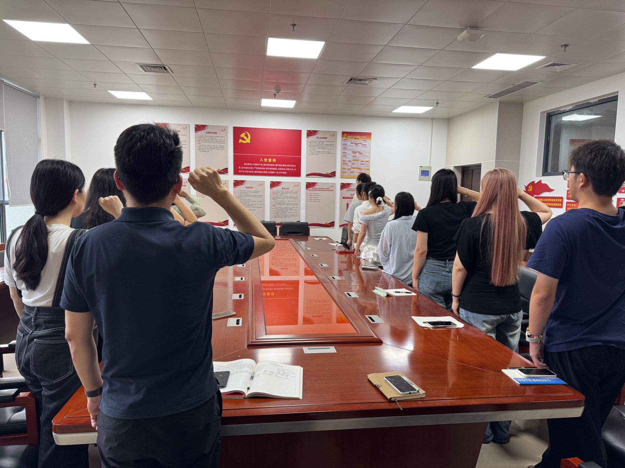 会议最后全体起立,领誓人汪君老师站在党旗前,右手握拳举过肩,带领全体党员宣誓。新发展预备党员和全体党员面向党旗,齐声宣读入党誓词。宣誓过程中,全体党员声音洪亮、神情庄重,誓词字字铿锵,表达了对党的无限忠诚和为共产主义事业奋斗的坚定决心。