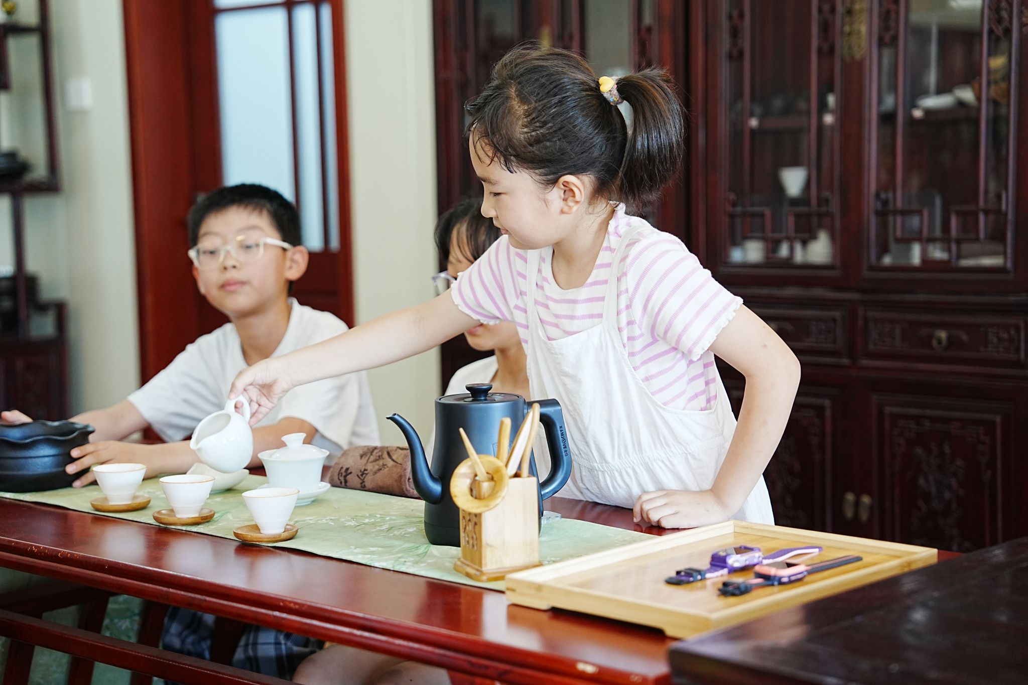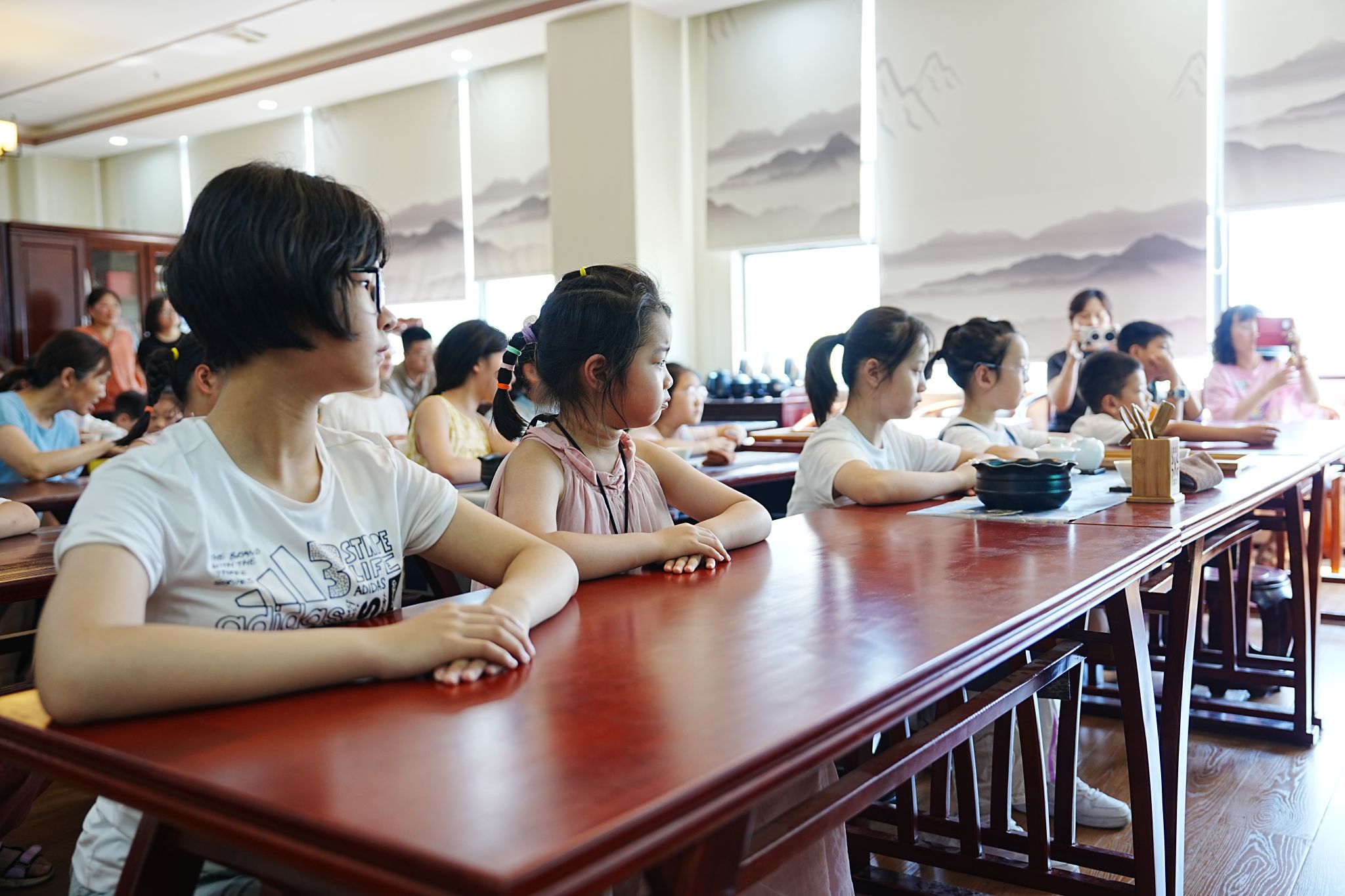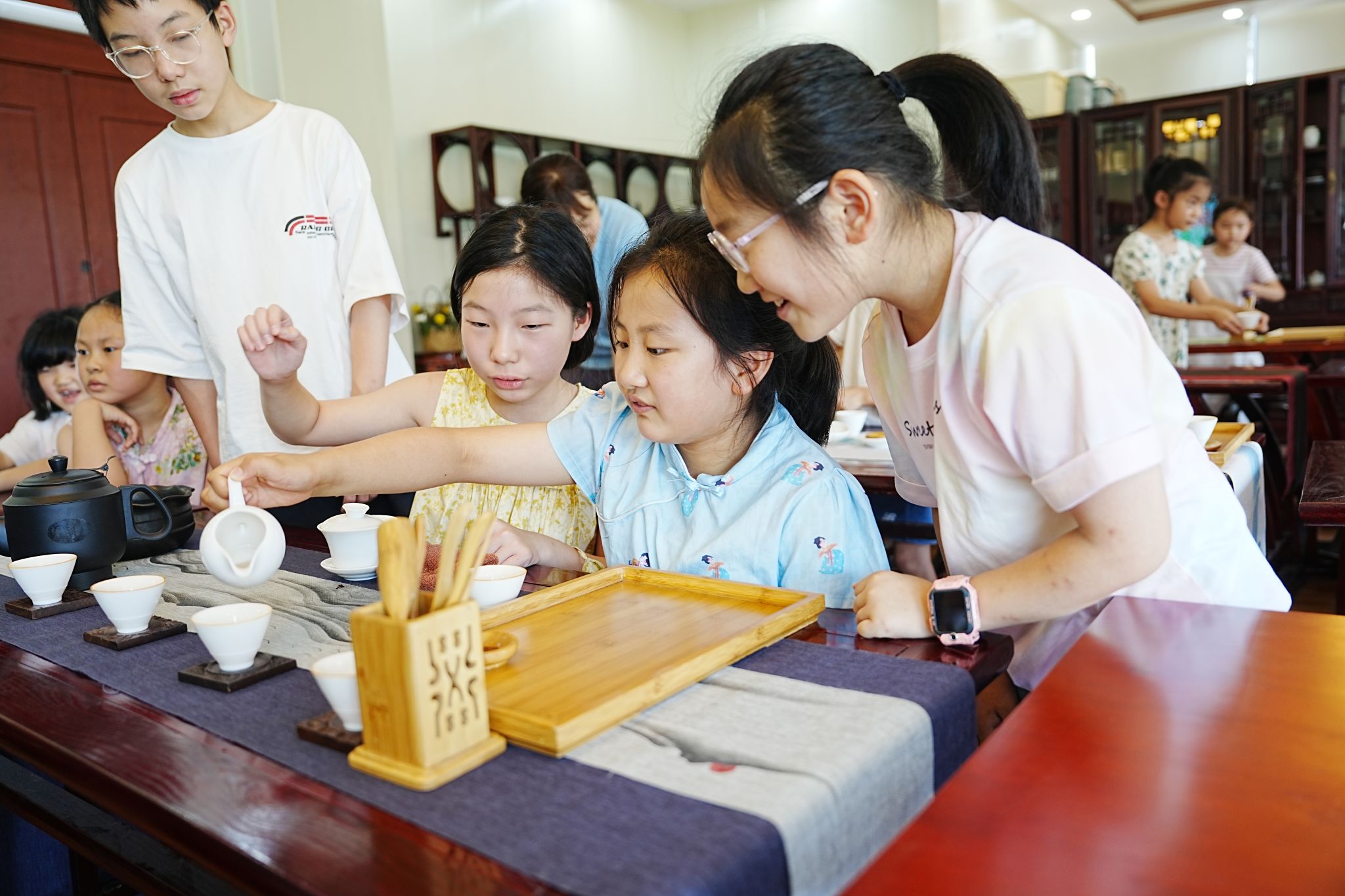活动现场氛围热烈,孩子们积极参与互动,在专业老师的指导下学习茶叶辨识、茶具使用、茶艺冲泡流程等知识,在传统文化的熏陶中提升了自身素养,感受茶文化的独特魅力。