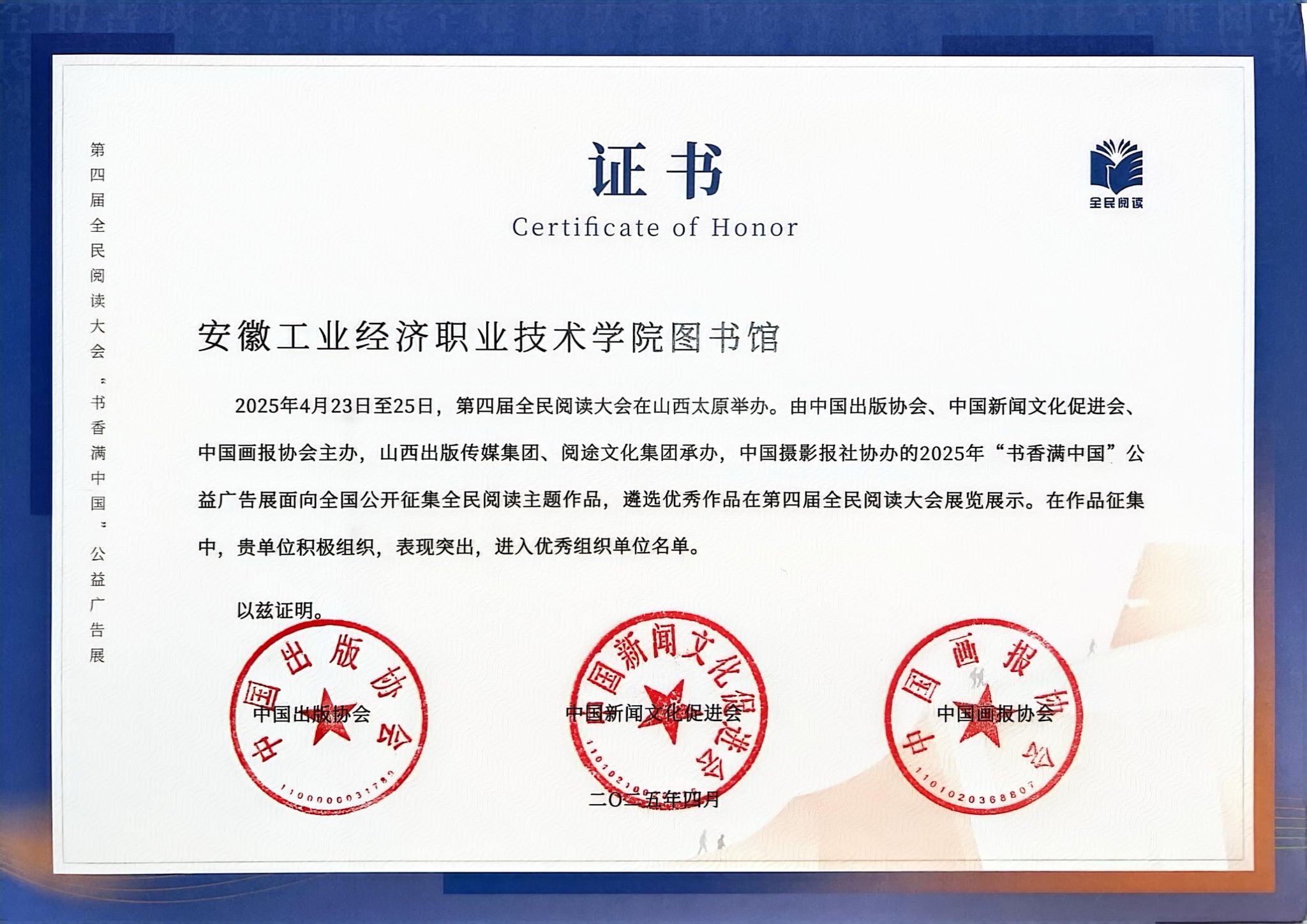 近日,安徽工业经济职业技术学院图书馆凭借在第四届全民阅读大会系列活动之2025年“书香满中国”全民阅读公益广告作品征集活动中的突出组织工作,荣获“优秀组织单位”称号。