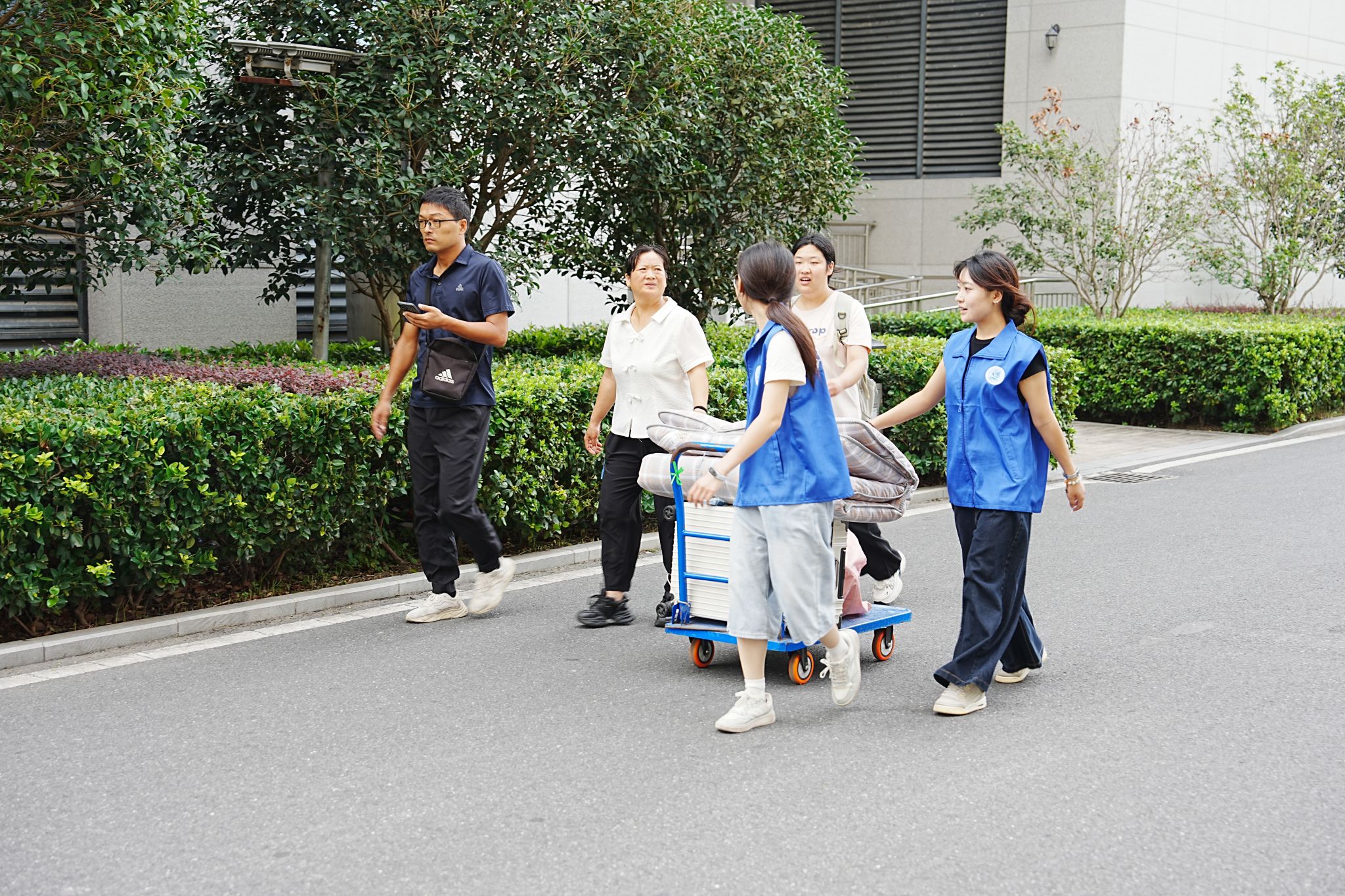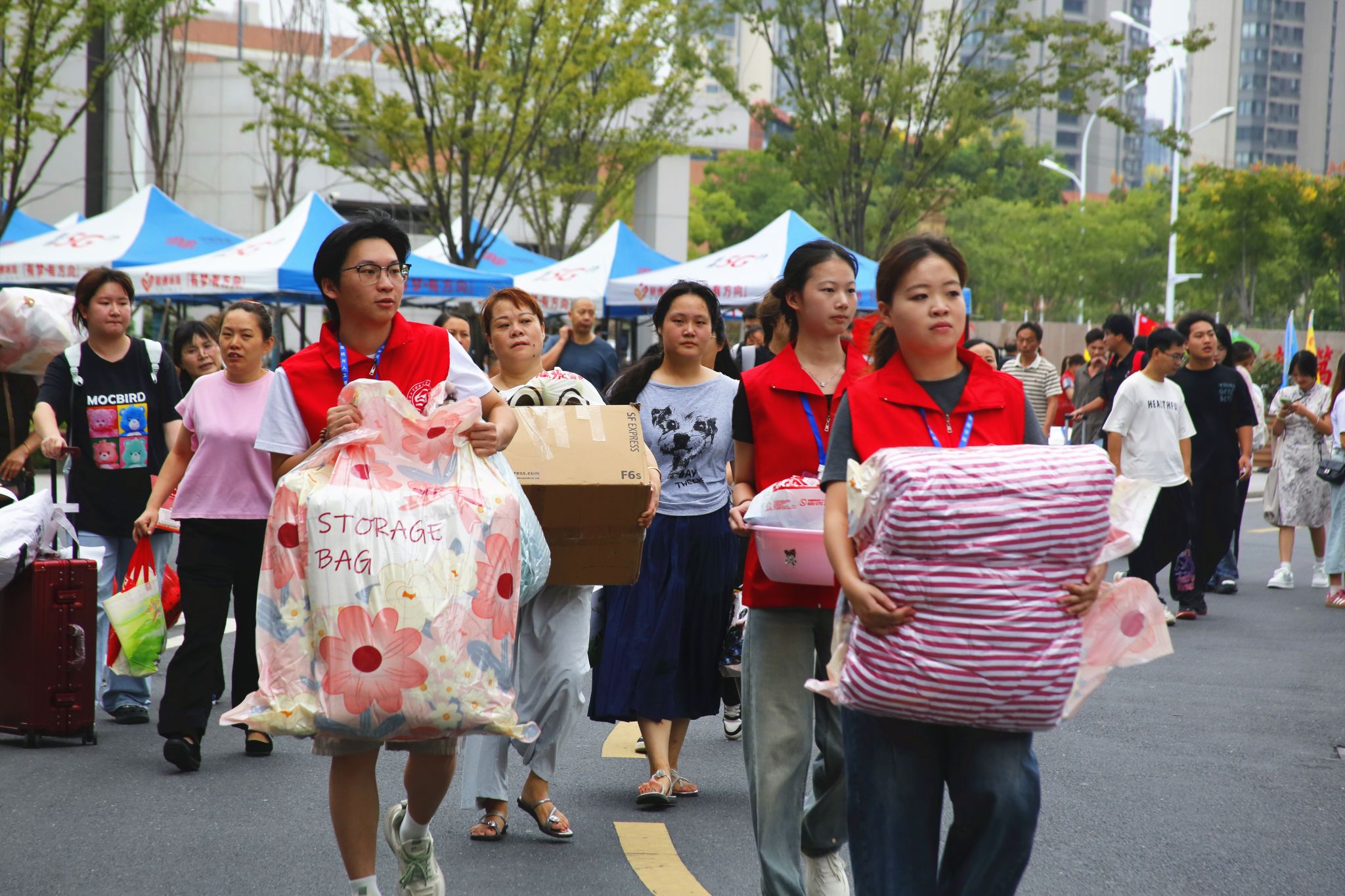 报到当天,校园里处处洋溢着热烈而温馨的氛围,各二级学院报到点一早就已准备就绪。南大门前车流有序,人流如织,身穿各色志愿服的同学们在校园内外忙碌地穿梭,从车站接站到入口引导,从行李搬运到入住协助,他们用热情的笑容和细致的服务温暖着每一位初来乍到的新生与家长。今年,学院共组织校院两级志愿者700余人,他们成为迎新工作中最动人的“青春名片”。