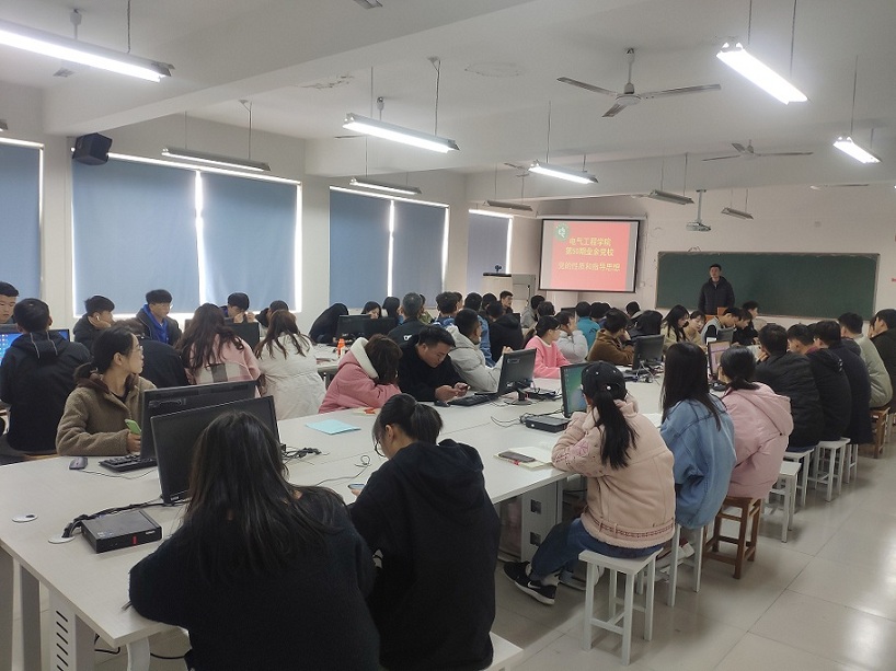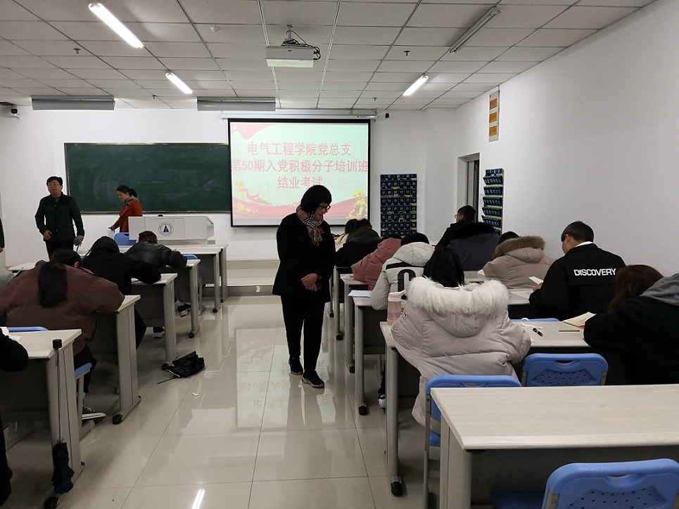 在新中国成立70周年之际和“不忘初心、牢记使命”主题教育的重要时刻,电气工程学院党总支于12月组织开展第50期业余党校培训班。本次培训班采用理论与实践相结合的形式,内容丰富、针对性强。包括专题讲座、小组讨论、党课报告、观看视频等内容,从党的性质、指导思想和宗旨、党员的义务和权利,发展党员基本程序等方面,对入党积极分子进行系统培训。培训结束后,全体学员参加了统一考试,校党委副书记、党校校长周和平巡查考场。