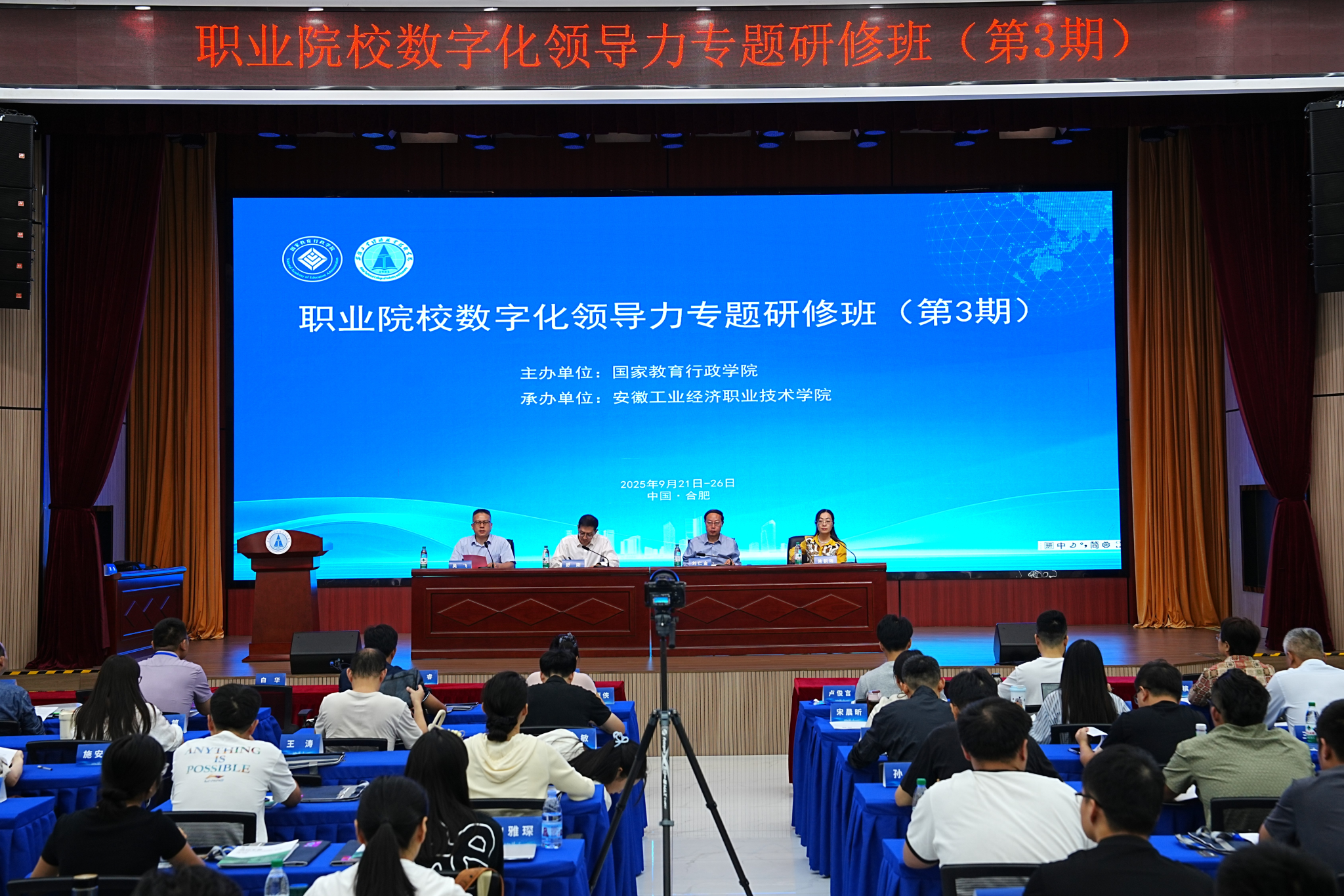 9月22日上午,由国家教育行政学院主办、安徽工业经济职业技术学院承办的“第三期职业院校数字化领导力专题研修班”在我院正式开班。国家教育行政学院进修二部主任舒刚,院党委副书记、院长刘仁金,国家教育行政学院职业教育研究中心研究员佛朝晖出席开班式并致辞。院党委委员、副院长吴飞主持。