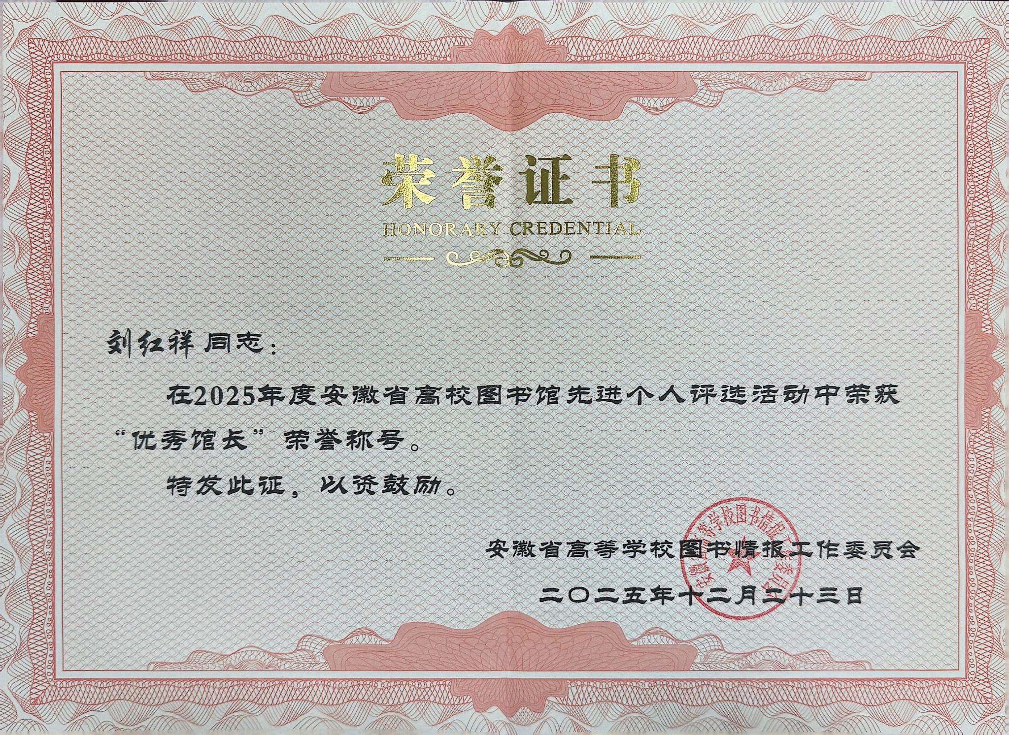 1月8日至10日,2025年安徽省高校图书馆馆长年会在宿州市举行。省委宣传部、省教育厅相关领导出席指导,来自全省60余所高校的120余名图书馆负责人及馆员参会。学院图书馆荣获安徽省高校图书馆2025年度“先进集体”称号,图书馆负责人刘红祥荣获“优秀馆长”称号。