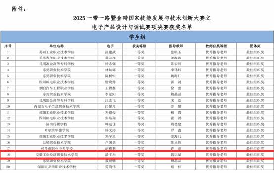 此次获奖,既是对智能制造学院人才培养方案、课程体系与实践教学成果的充分肯定,也为学生技能成长与职业发展增添了信心与动力。展望未来,学院将继续紧扣产业发展需求,深化教育教学改革,加强高素质技术技能人才培养,为电子信息产业高质量发展持续输送新鲜血液与坚实力量。(智能制造学院:钱宗斌 审核:孙继胜 张丽 )