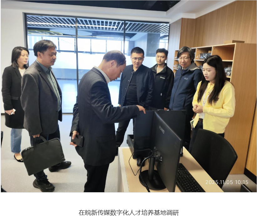 在皖新传媒数字化人才培养基地,总经理高雅婷陪同刘仁金一行了解企业在数字媒体技术、文化创意内容、新媒体运营等领域的产业生态与发展规划。计算机与人工智能学院院长朱晓彦结合数字媒体技术专业的教学资源、实训条件及校企共建工作室运营与企业进行了交流。双方聚焦“媒体技术+内容运营+数字创意”专业群建设和校企联合培养模式进行探讨,初步商定将在学生实习实践、短期项目训练、产学研平台搭建等方面开展实质性合作。