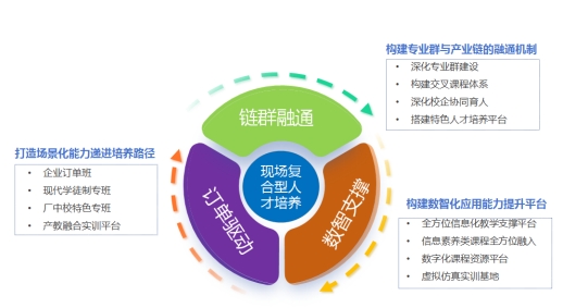 打造智能制造专业集群。对接智能制造产业链智能装备组装、产线数字运维、工艺优化创新等复合型岗位需求,整合电气自动化技术等5个专业,组建省级电气自动化专业群;深化课程交叉,重塑专业形态。构建“底层共享、中层互融、拓展互选”的专业群课程体系,适应产业链对复合型人才需求;搭建特色人才培养平台。成立“智能制造产业人才学院”,创新校企合作机制,推动校企共定方案、共建课程、共组团队、共提质量。