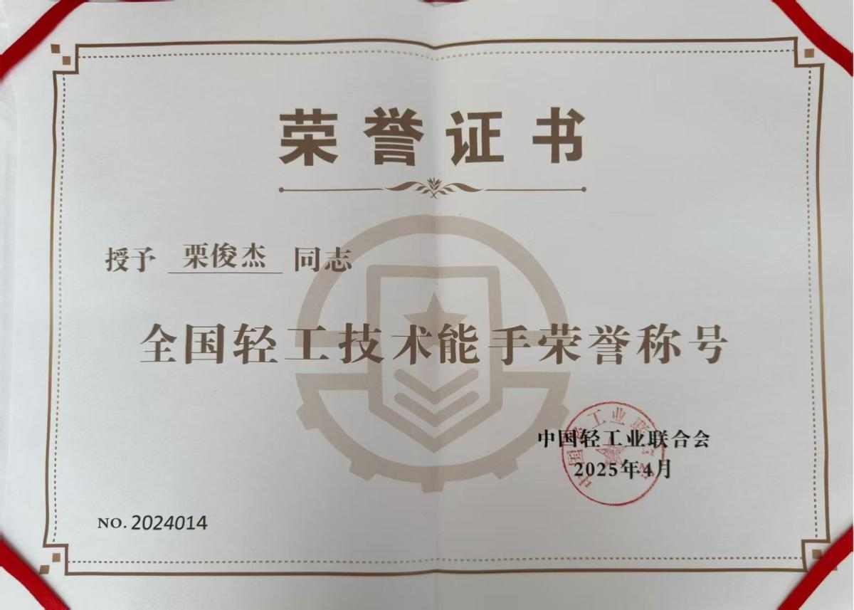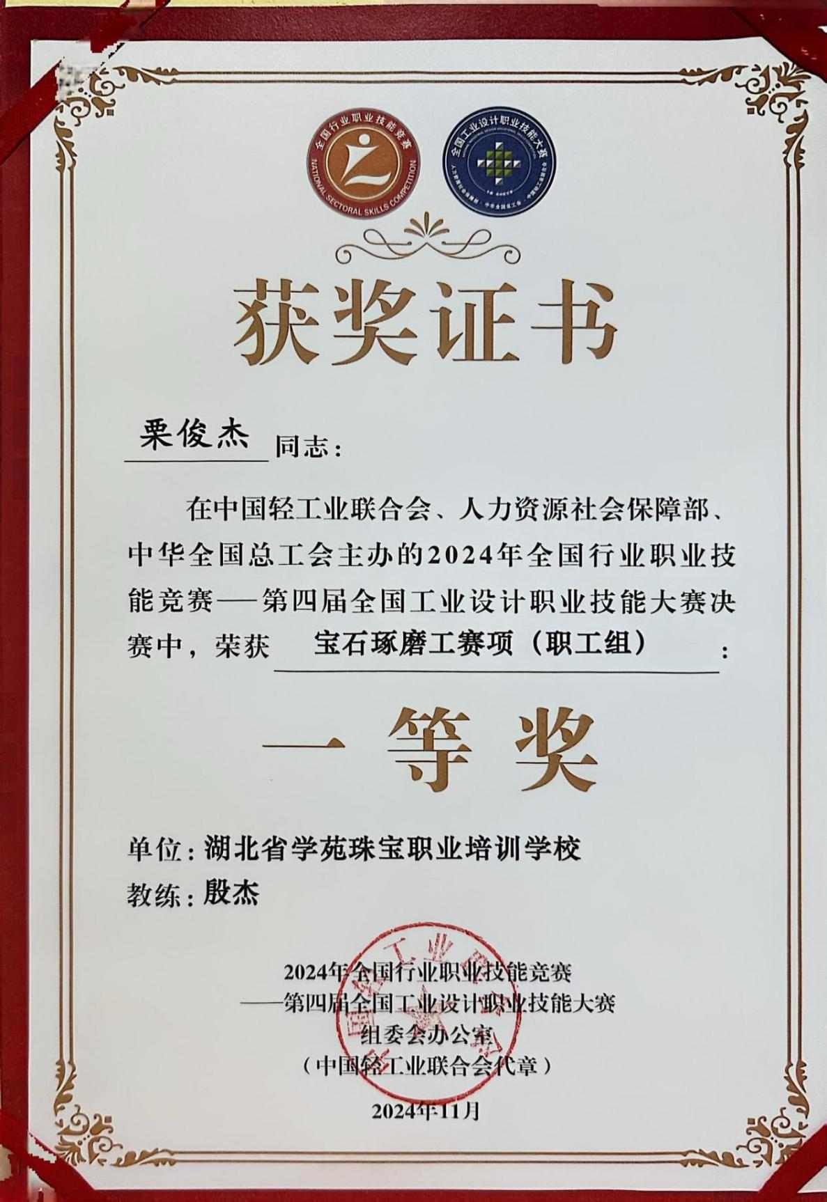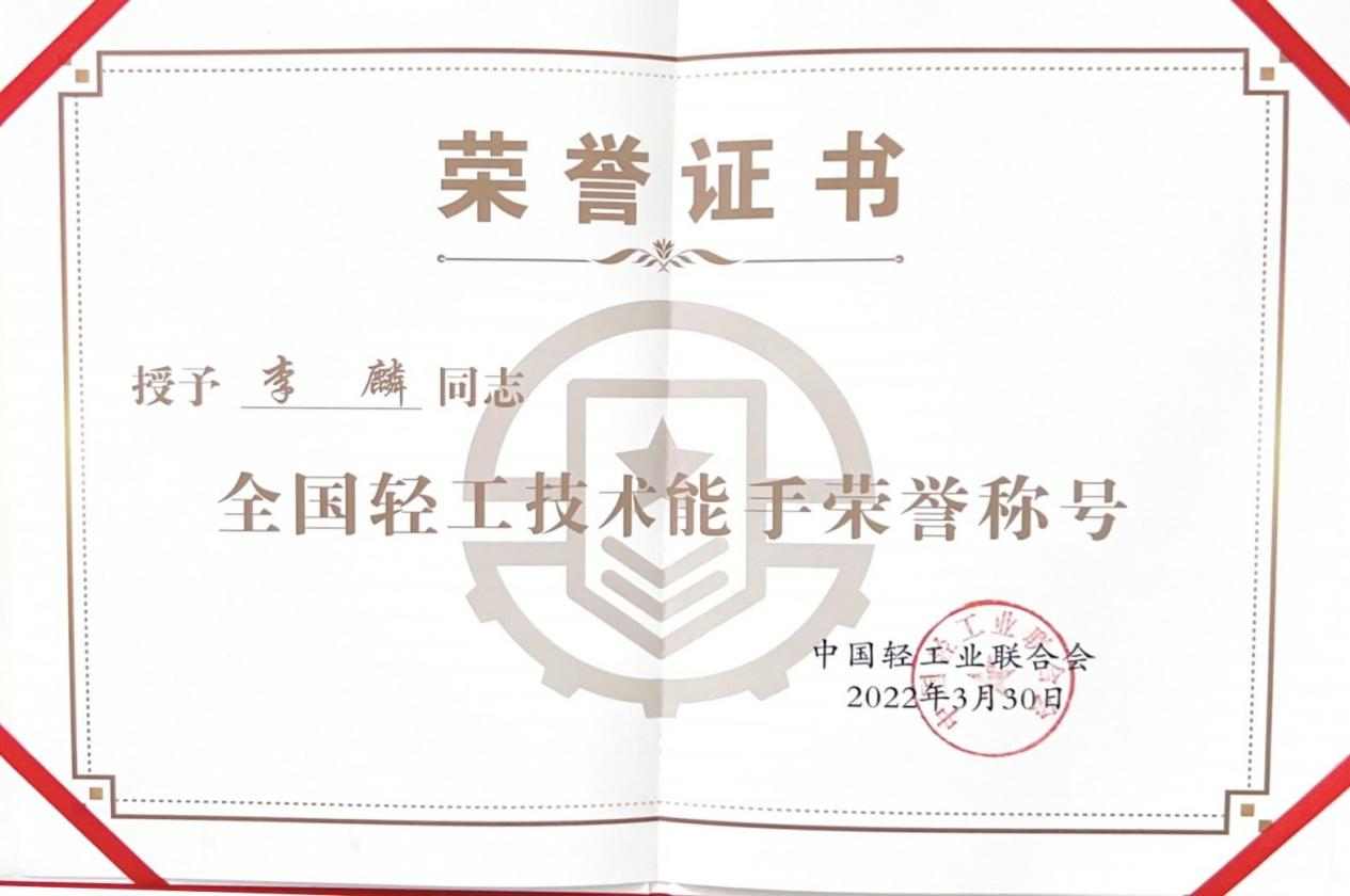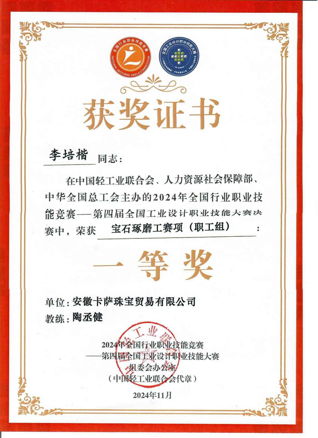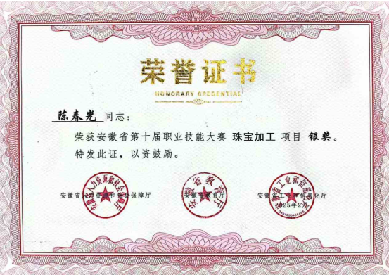 2024年参加第四届全国工业设计大赛宝石琢磨工赛项职工组第一名荣获“全国五一劳动奖章”候选人和“全国轻工技术能手”称号。
