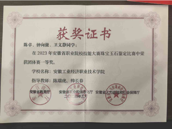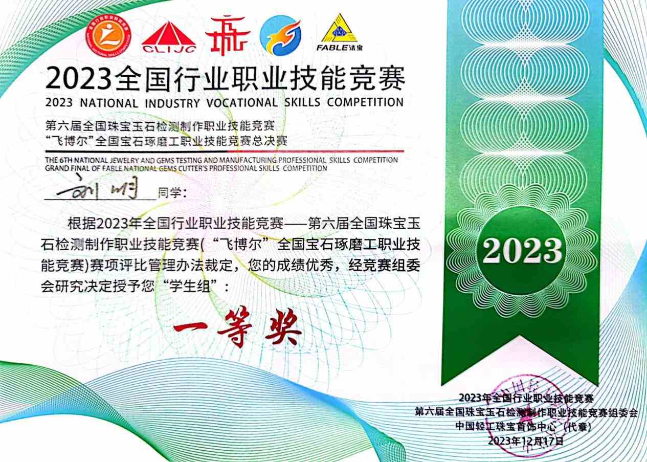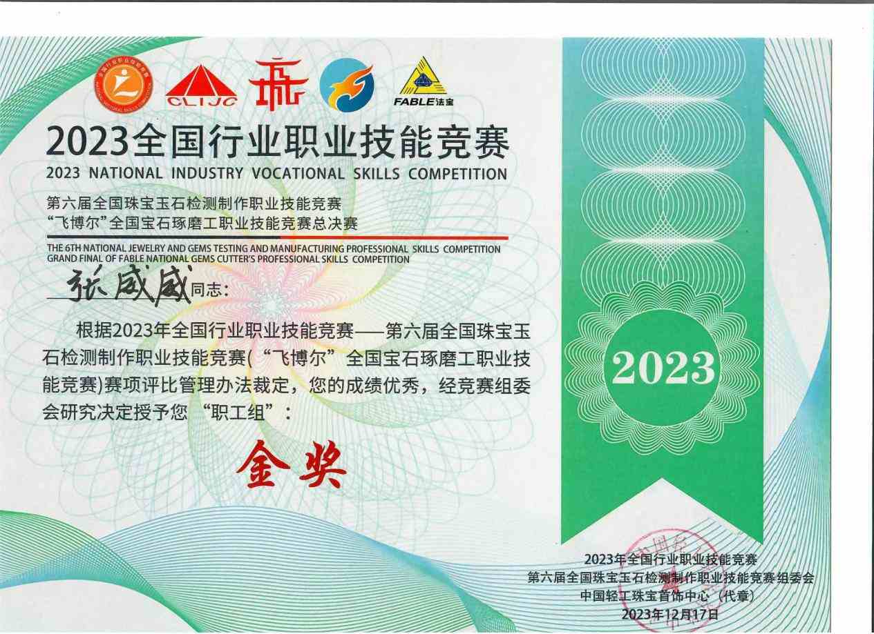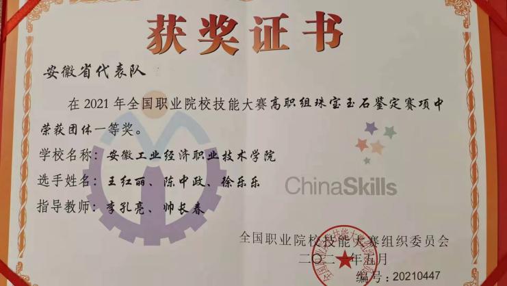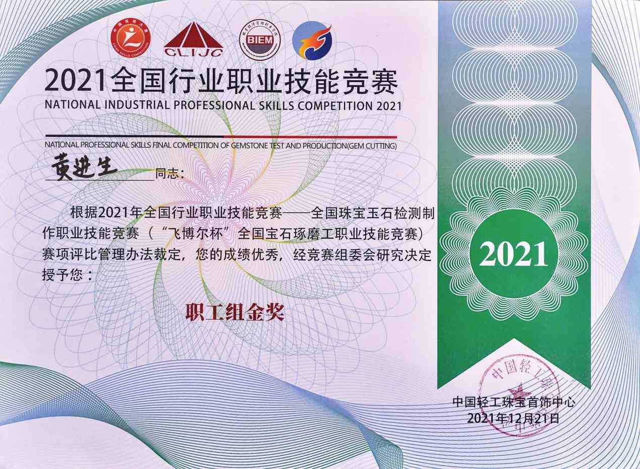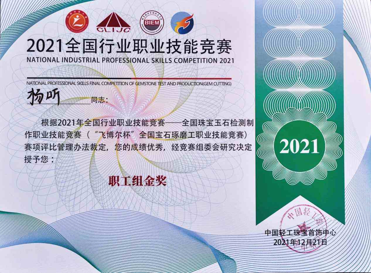 2021年在校期间参加全国行业职业技能竞赛-宝石琢磨工职业技能竞赛获得一等奖;