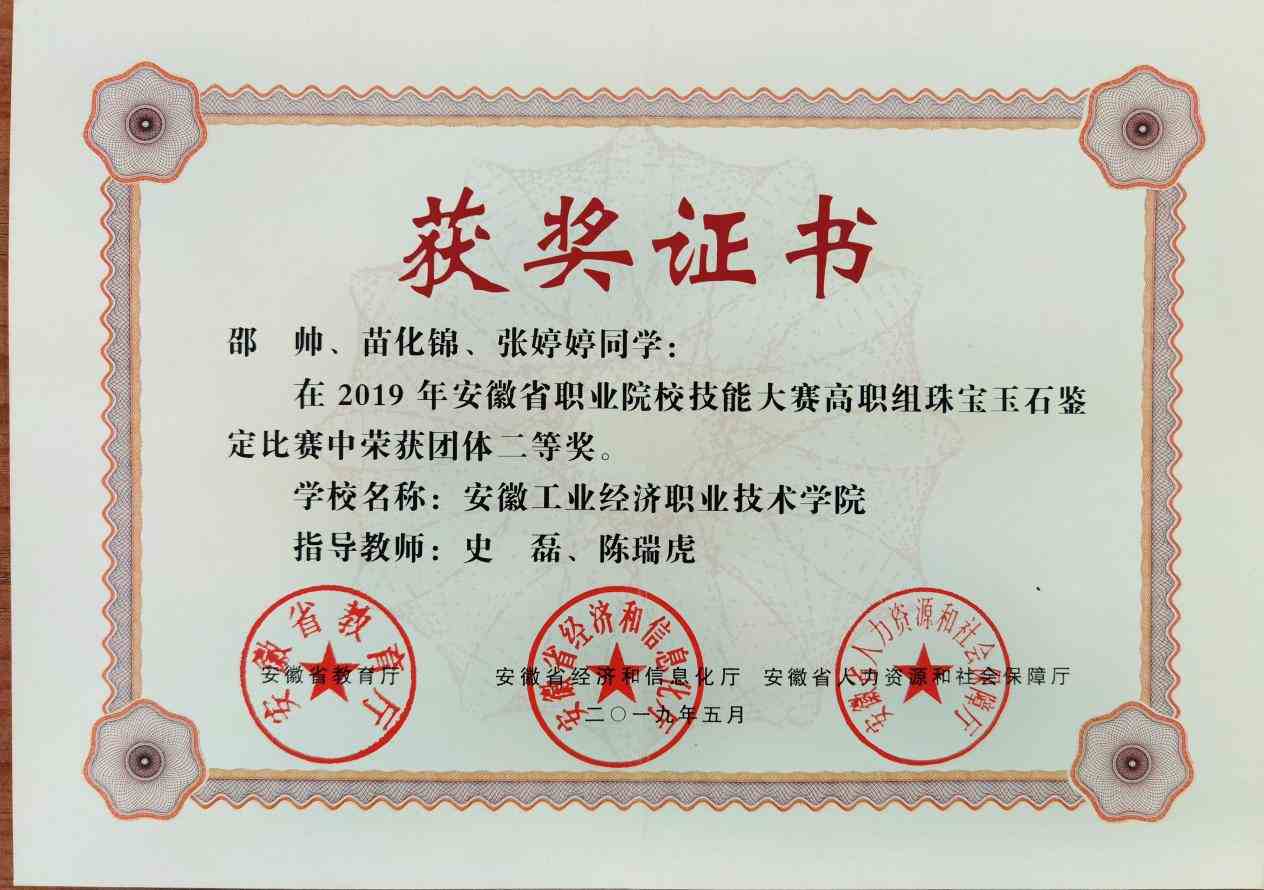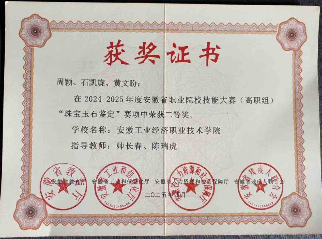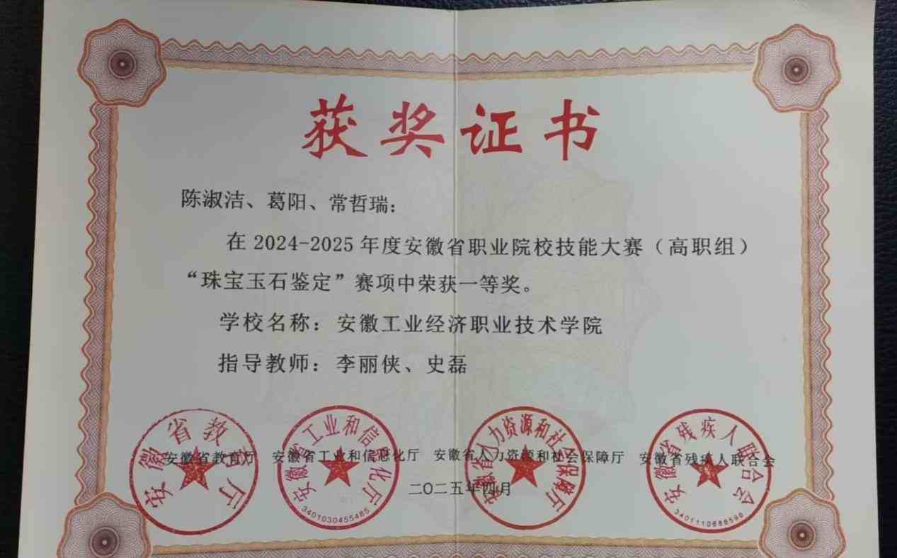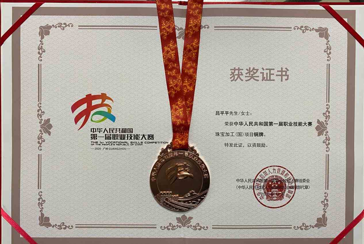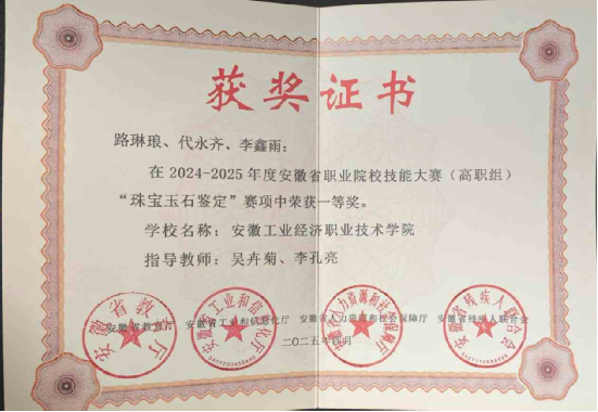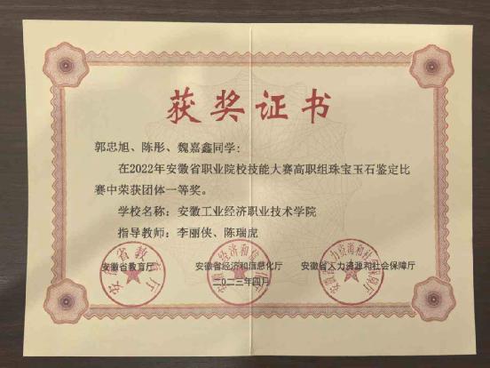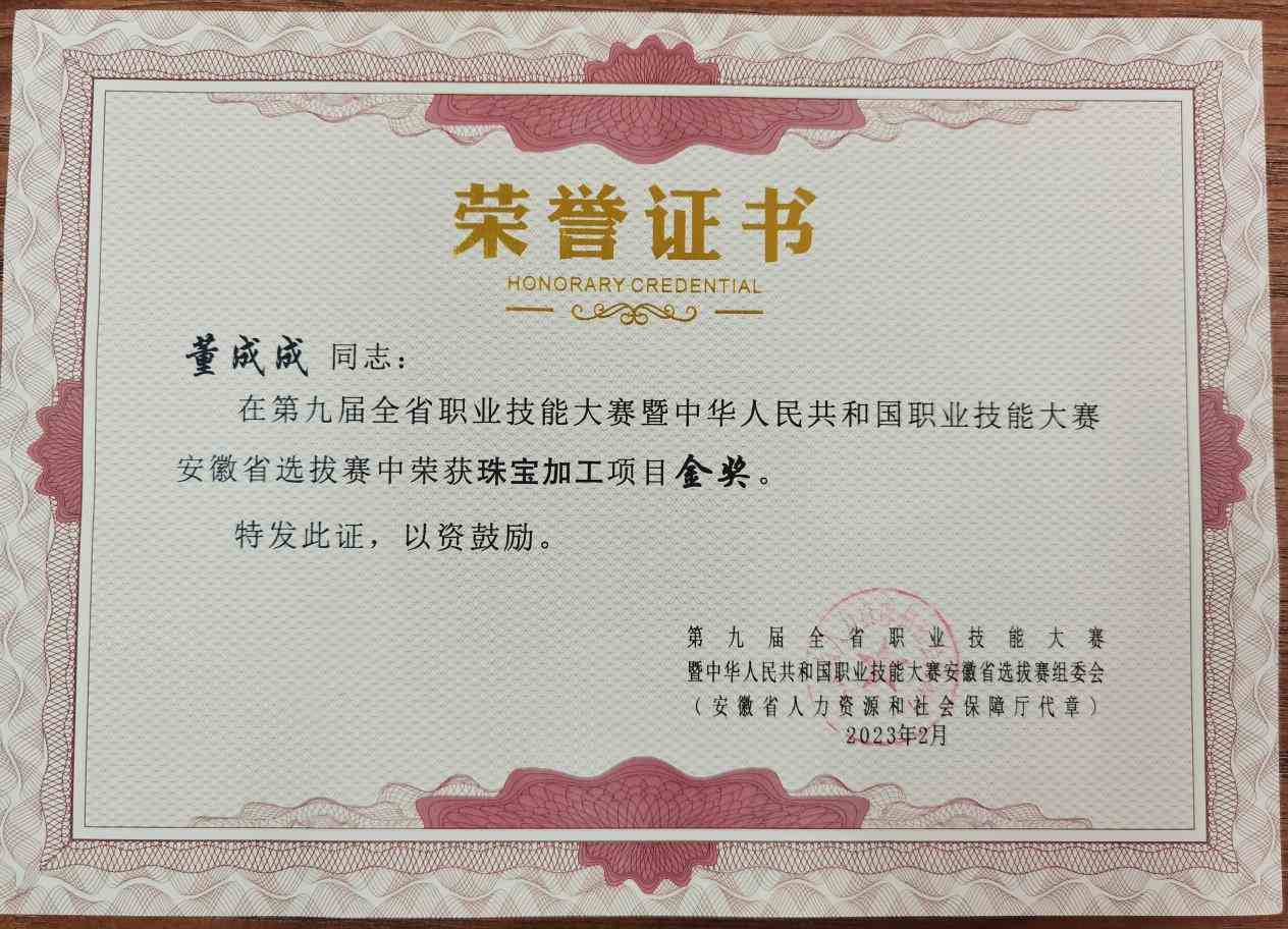 2021年在校期间参加全国行业职业技能竞赛-宝石琢磨工职业技能竞赛获得一等奖;