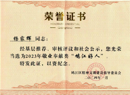 荣获芜湖市鸠江区2023年"鸠江好人"称号