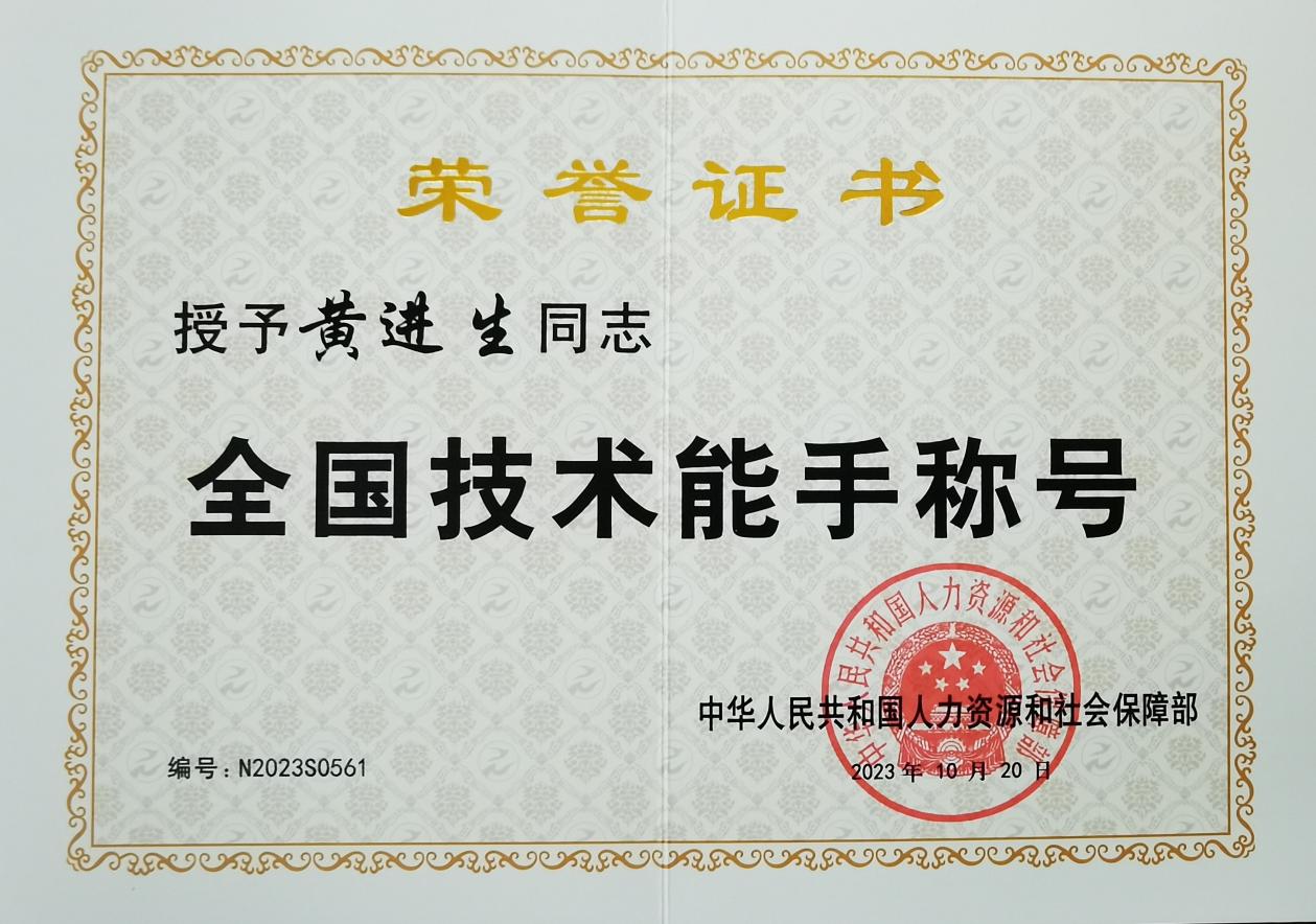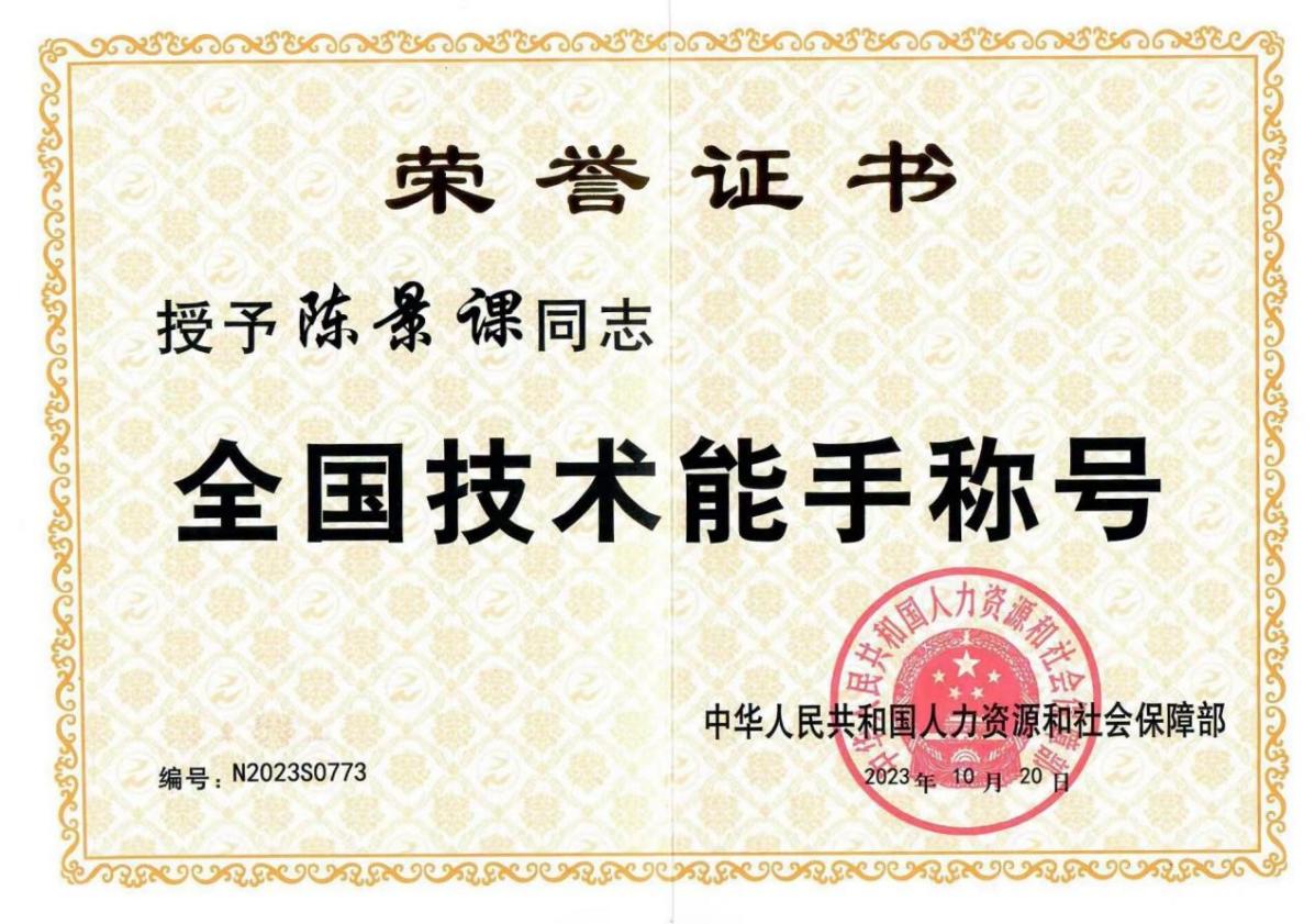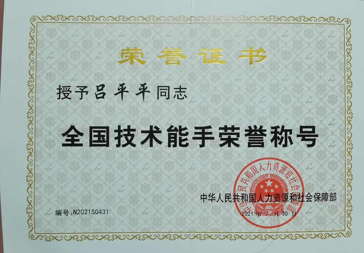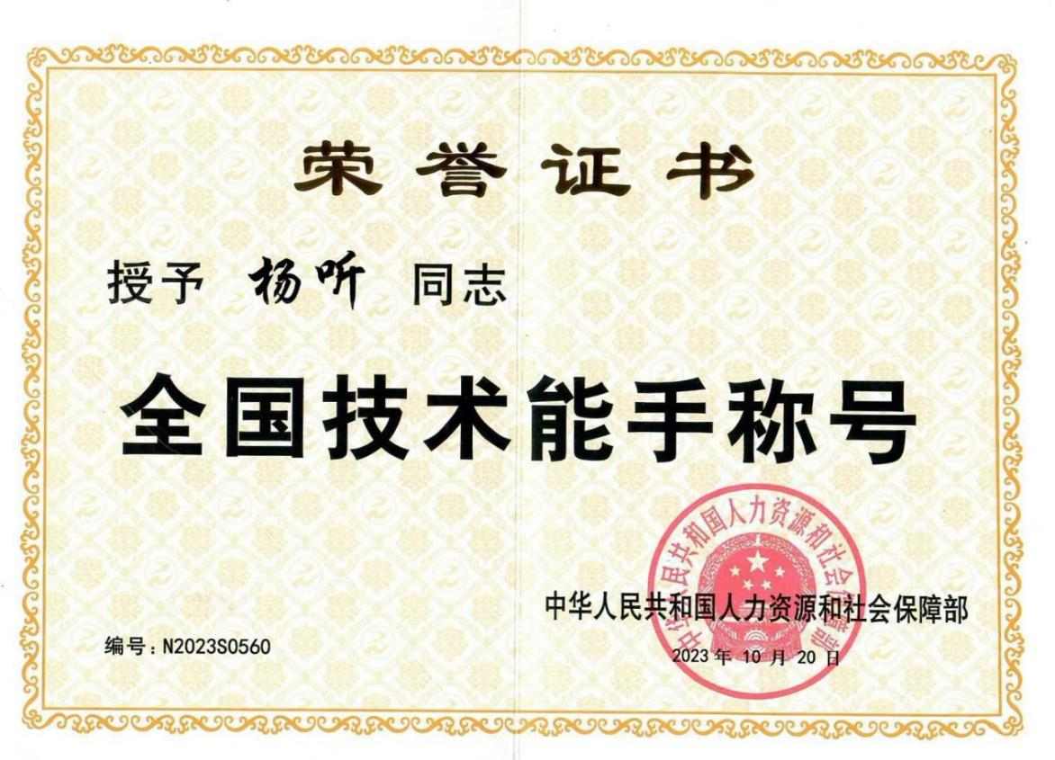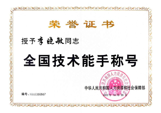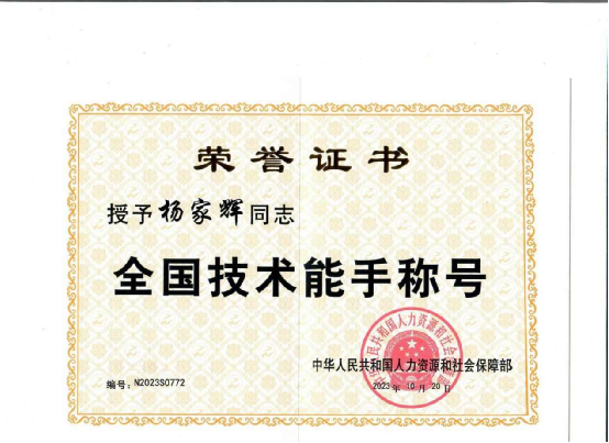 2023年获得全国技术能手荣誉称号;