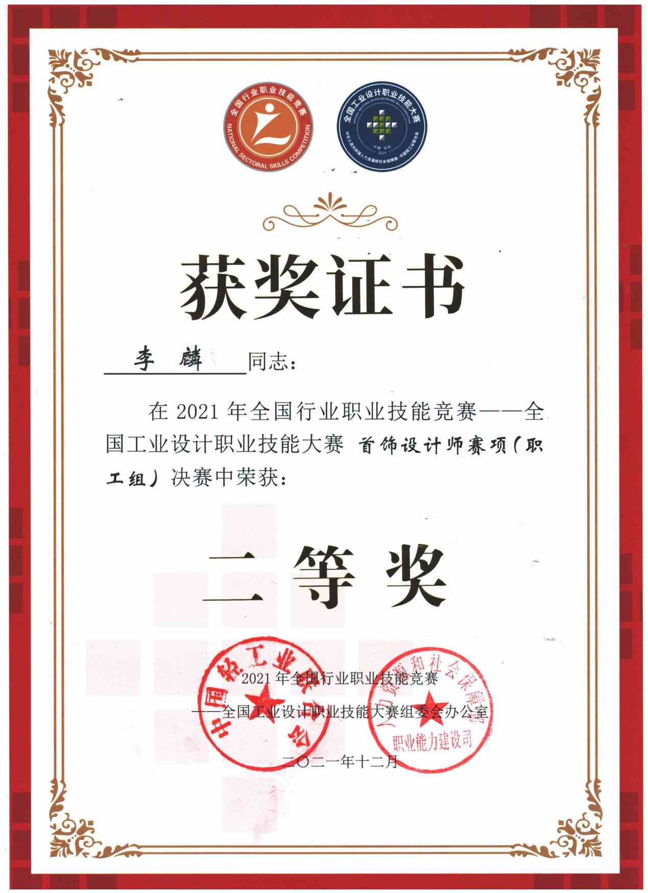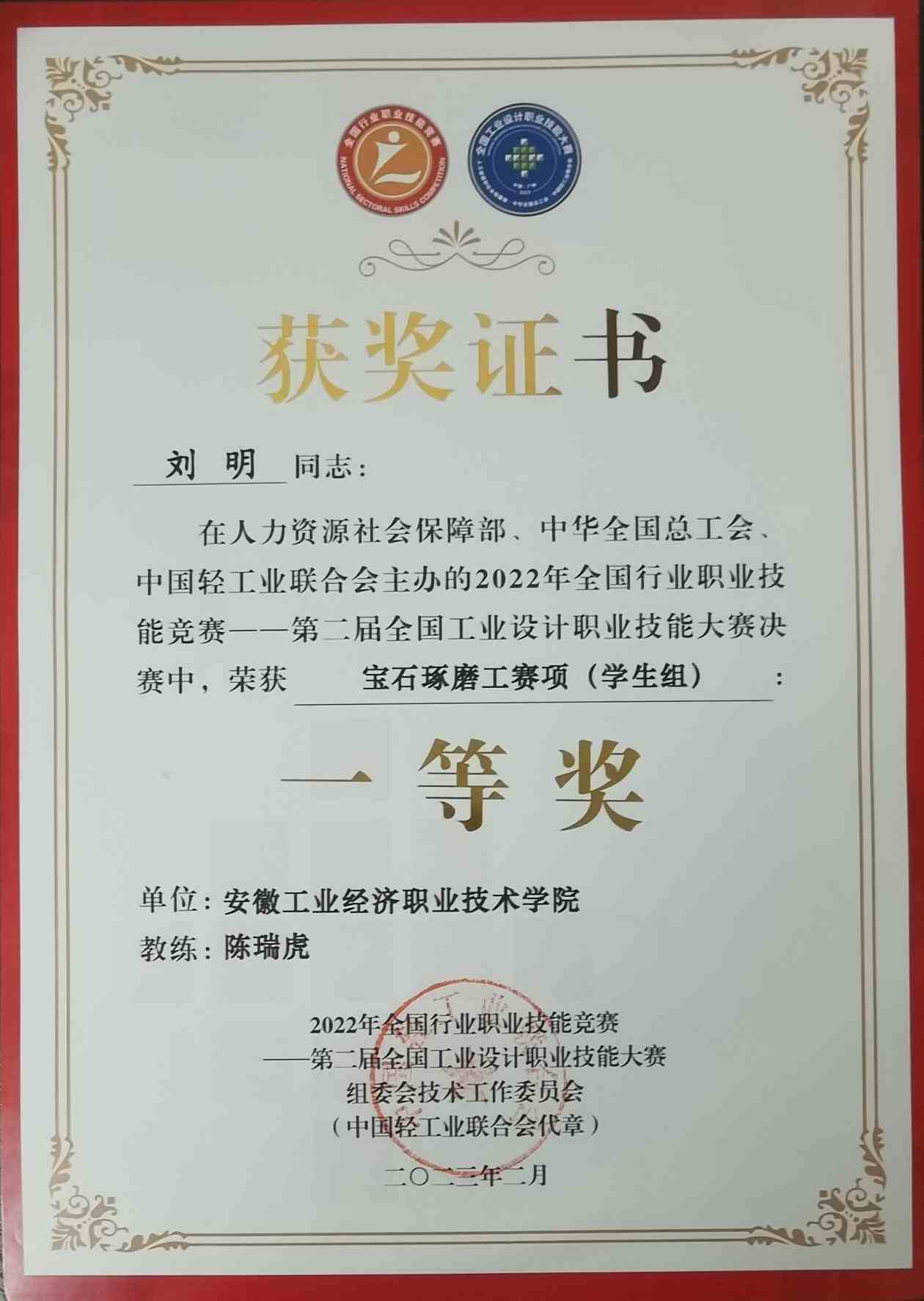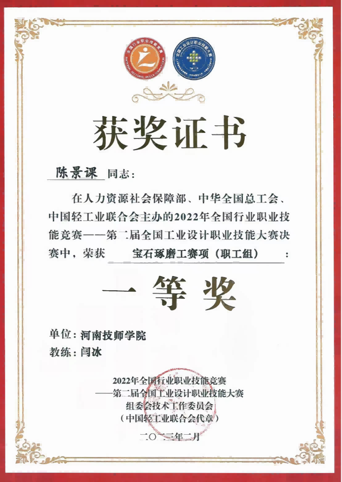 2023年参加第二届全国工业设计大赛宝石琢磨工赛项获得职工组一等奖;